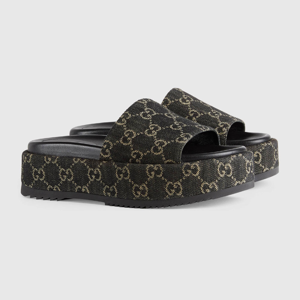 A cult material. denim is reimagined through the Gucci lens with an unmistakable logo feel. This pair of sandals is presented in a jacquard version of the material with an allover monogram motif. The shoes platform sole adds a retro note.