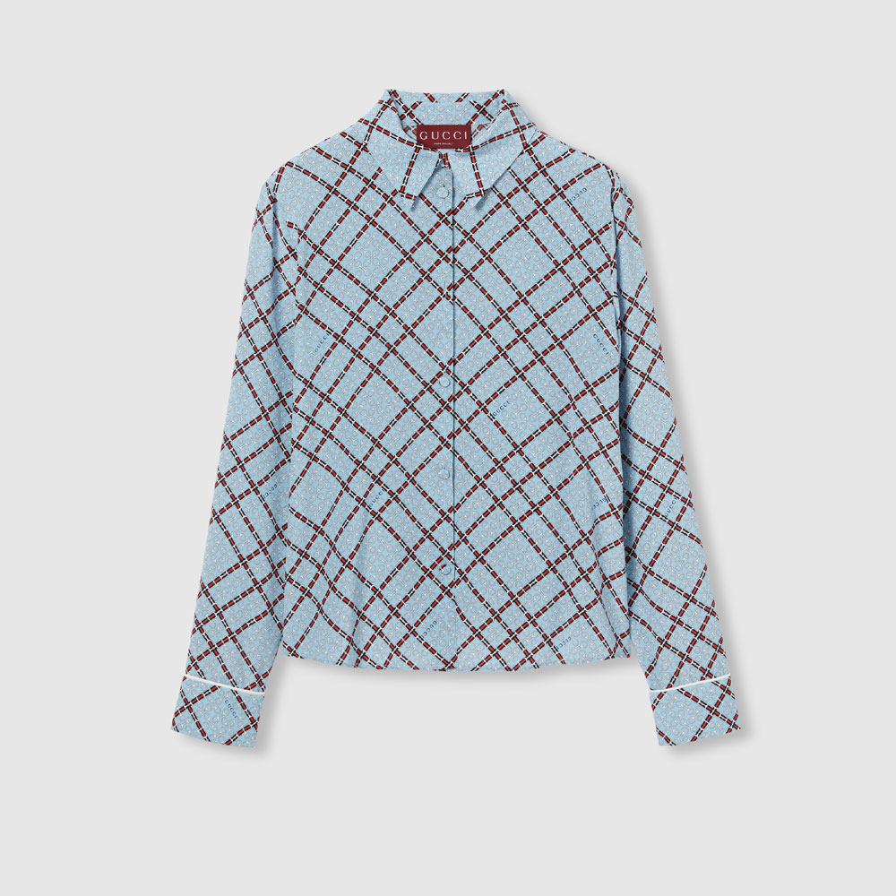 Gucci Printed Silk Crepe de Chine Shirt in Light Blue offers a timeless elegance perfect for elevated casual or office ensembles. Pair this Cruise '25 piece with tailored white trousers for a crisp, tonal contrast, or layer under a fitted blazer in navy to highlight its equestrian motifs.