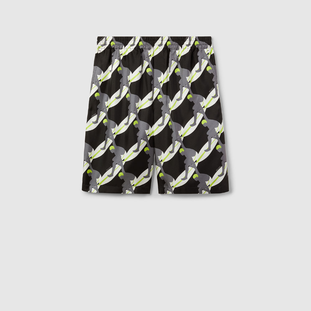 Pair the Gucci Printed Silk Twill Shorts in Black Green with a crisp white linen button-down shirt for a relaxed yet polished daytime look. The shirt's minimalist design balances the shorts' vibrant tropical motifs. For evenings, layer with a lightweight navy blazer and a plain black crewneck tee to highlight the earthy and oceanic hues.