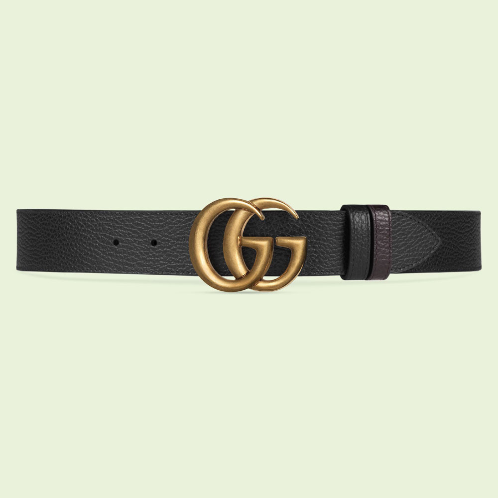 A reversible leather belt in textured leather. finished with the Double G buckle. The hardware was inspired by an archival design from the '70s-a hallmark era of the House.