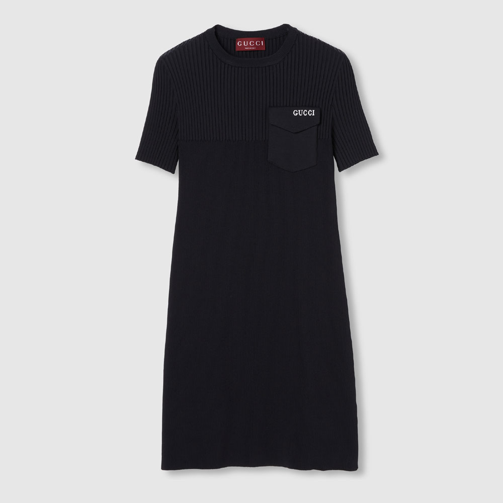 This relaxed yet elegant ribbed viscose dress from Gucci's Spring Summer 2025 line pairs effortlessly with minimalist accessories. Layer it with a cropped white blazer for polished daytime wear, or embrace a casual vibe by adding strappy sandals and a woven tote. The subtle jacquard detailing allows bold metallic jewelry to shine without overwhelming the look.