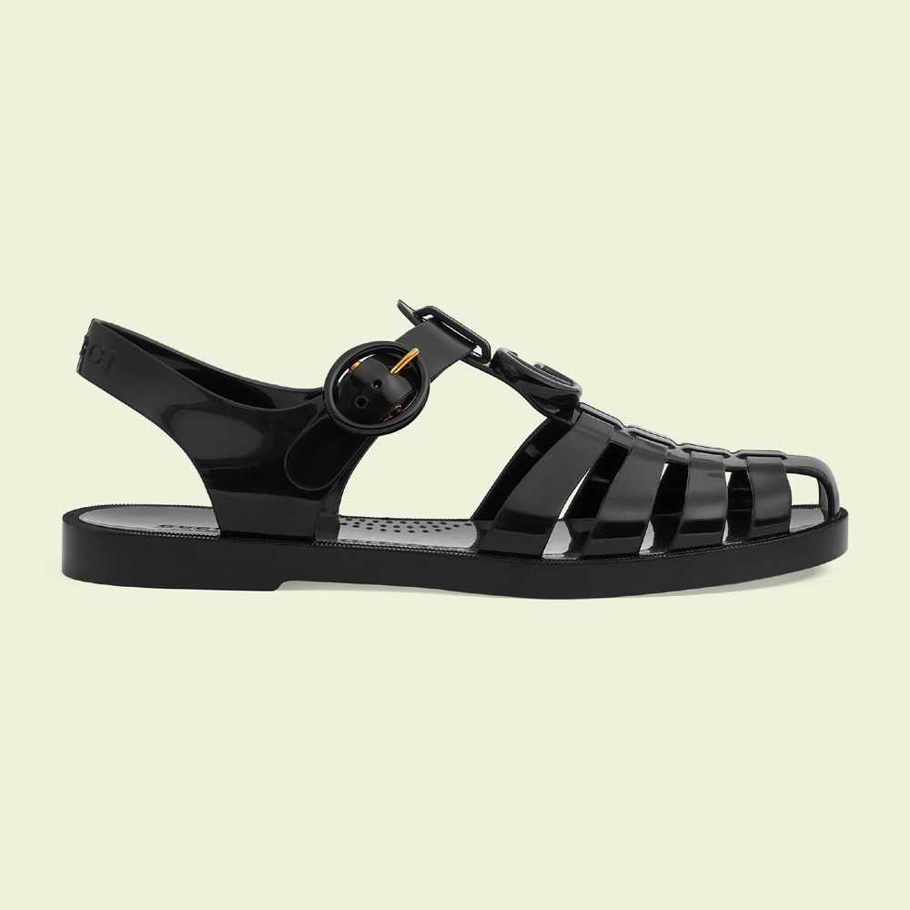 Recalling playful styles from the '90s. this sandal is presented in black rubber with a shiny finish. The shoe is distinguished by tonal Double G hardware and the name of the House at the back of the ankle strap. creating a link to the logomania trend that characterized this era.