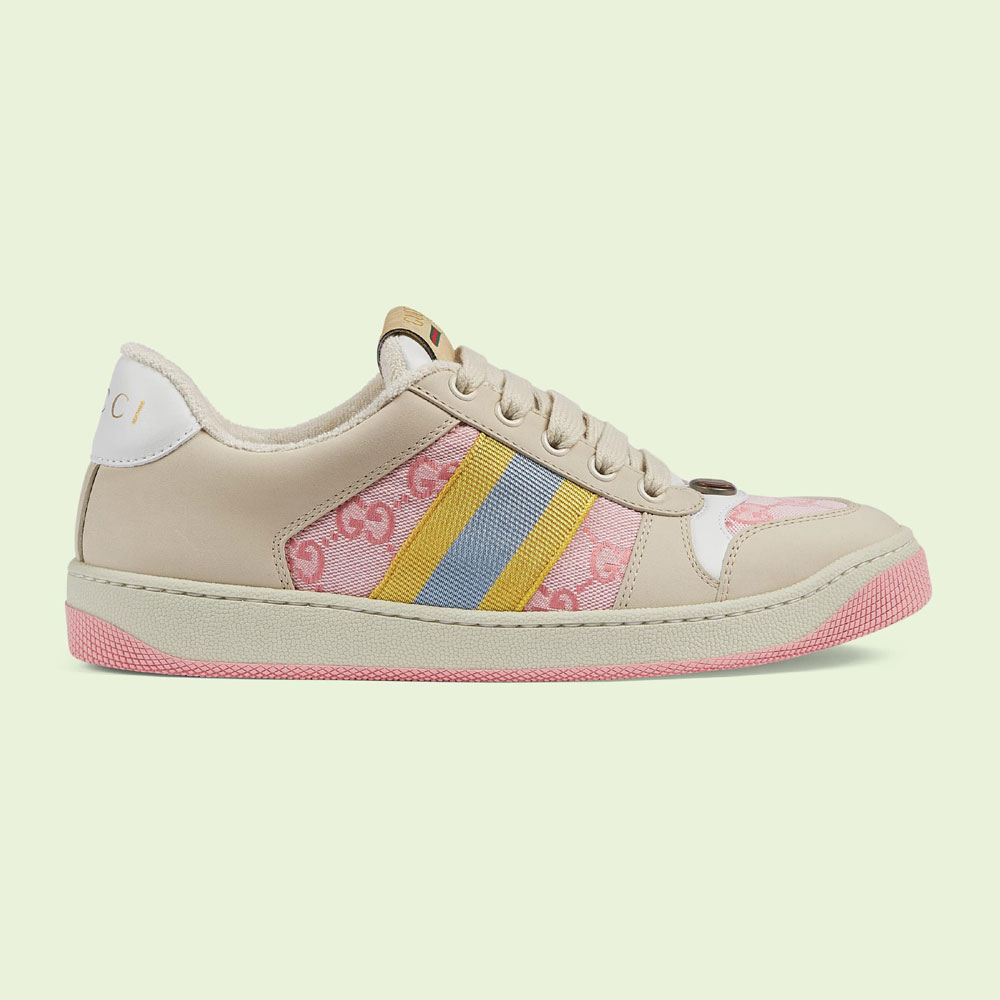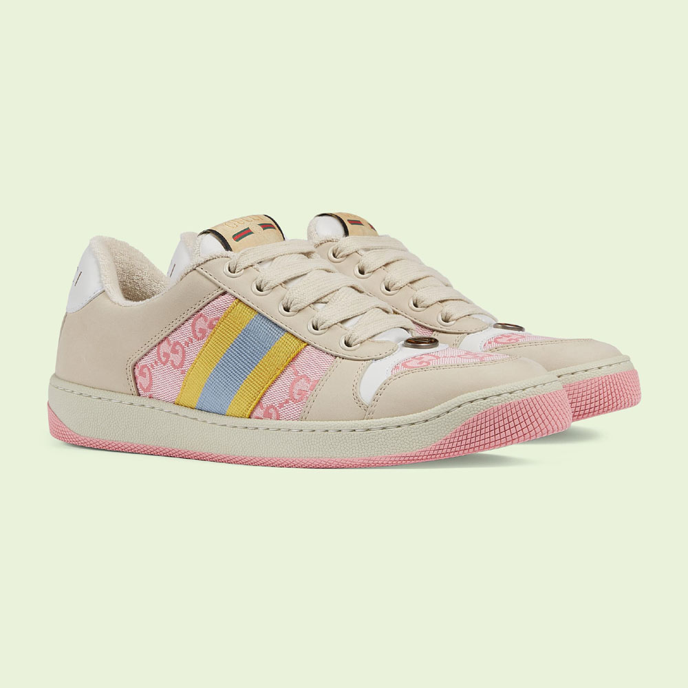 Influenced by classic trainers from the 70s. the Screener sneakersnamed for the defensive sports movefeature the Web stripe on the side and vintage Gucci logo. Here the emblematic style is presented in light pink GG canvas and defined by a beige suede trim.