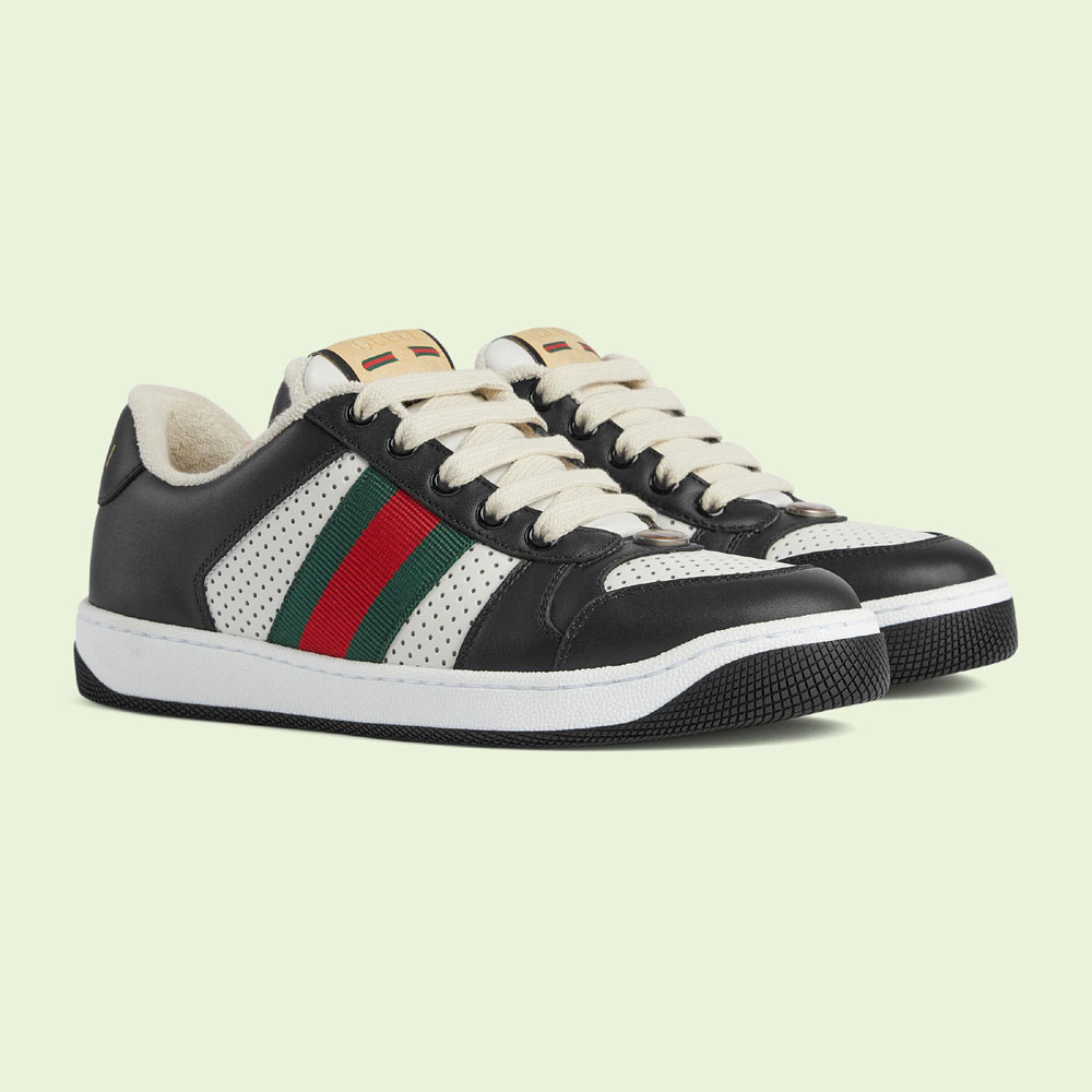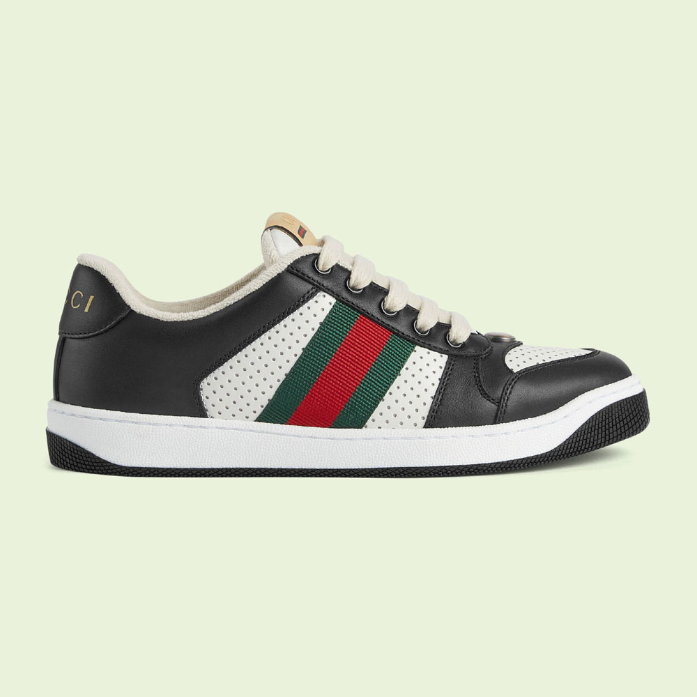 Influenced by classic trainers from the '70s. the Screener sneakersnamed for the defensive sports movefeature the Web stripe on the side and the vintage Gucci logo. White leather details complete the style. adding depth to the style through contrasting colors.