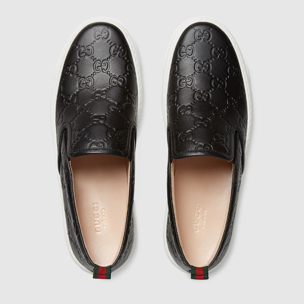 A slip on sneaker with a grosgrain Web pull on the back, made in heat debossed Gucci Signature leather resulting in a defined print with a firm texture.