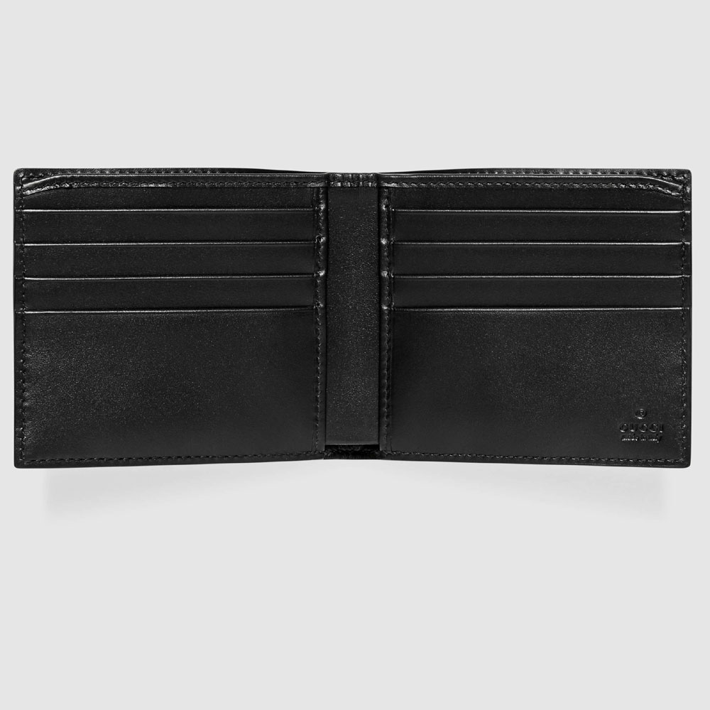 A combination of two of Gucci's most recognizable icons: the GG motif and the Web. This bi-fold wallet is made in heat debossed Gucci Signature with Gucci Web stripe detail.