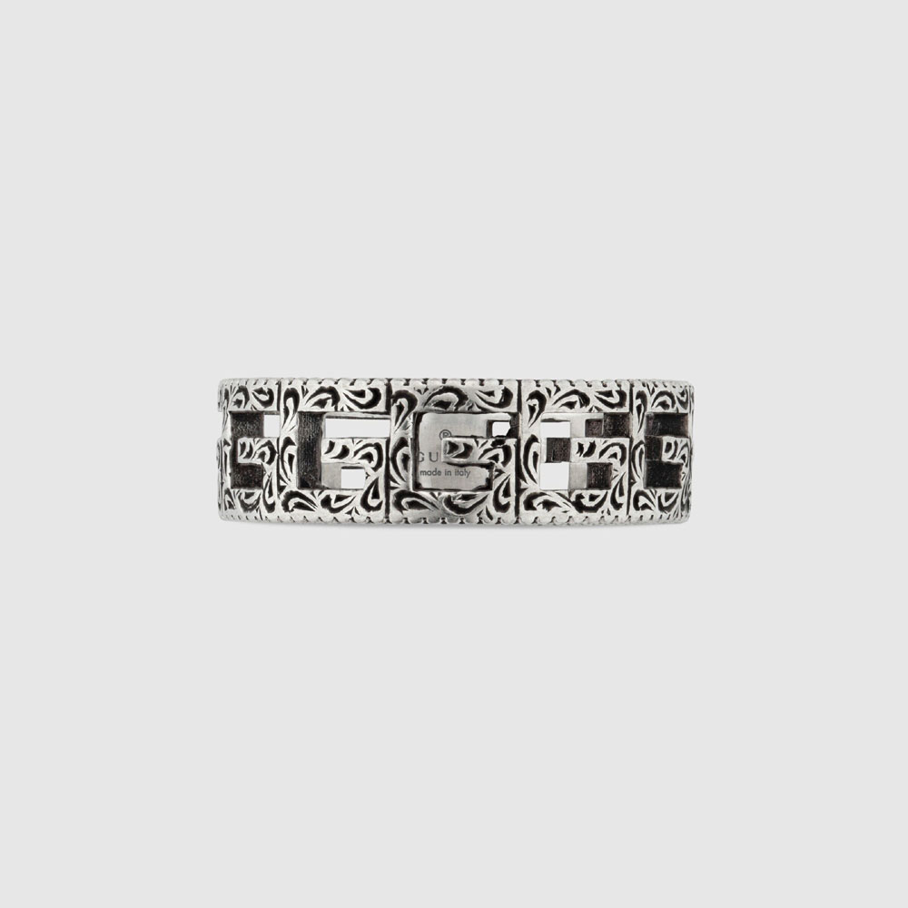 Pulled from the seventies' archives. the Square G is reworked in a defining cut-out motif on this ring crafted from aged 925 sterling silver. The geometrical pattern is embellished with Arabesque-style engravings. while textured edges trim the accessory.