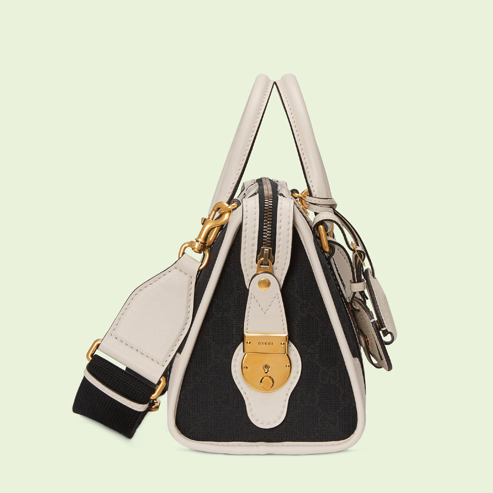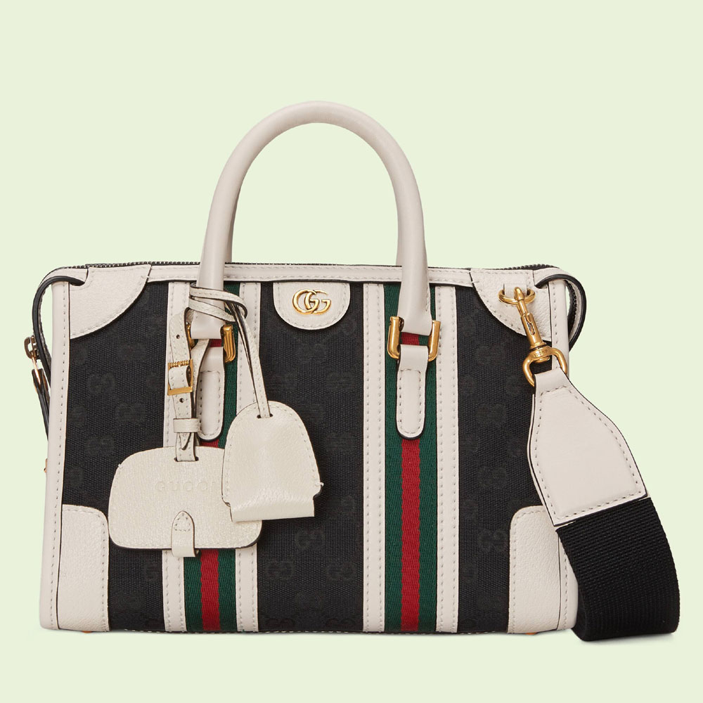 The top handle bag is reimagined in a new duffle style. part of the House's latest collection Exquisite Gucci. Crafted in black Original GG canvas. the Web stripe and Double G hardware characterize the silhouette with archival symbols of the House.