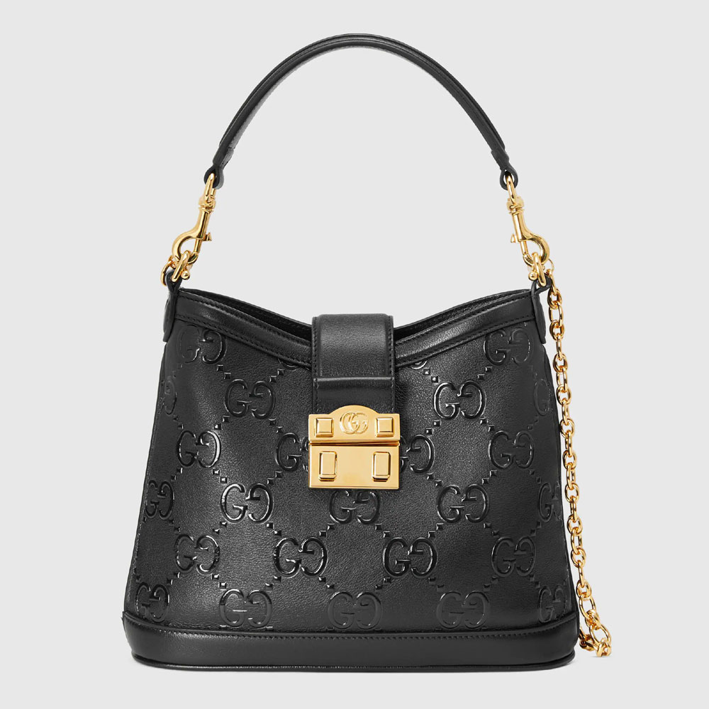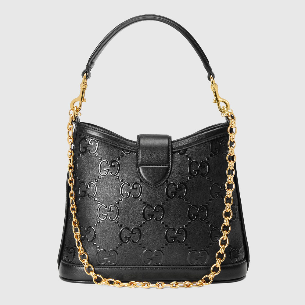 Enriched by decades worth of history. the GG motif evolves into new iterations each season. The symbol is a reference to not only the initials of the Founder of the House but also a subtle nod to the original Gucci Rhombi motif from the 30s. By bringing together different eras of Guccis heritage. the pattern can be seen as an ever evolving tribute to the brands origins. Here the monogram decorates a small shoulder bag in black.