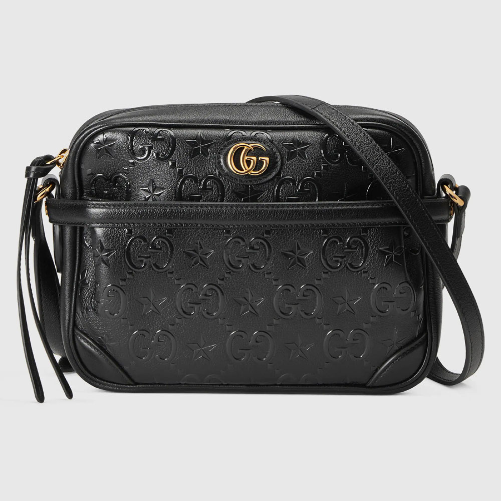 Contemporary House codes from the last six years are paired with symbols from Guccis heritage. A reference to the 30s archives. the GG motif is paired with whimsical stars as an ode to both the brands past and future. The embossed motif defines this black leather shoulder bag.