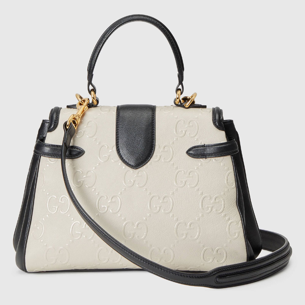 Speaking to an idea of timeless styles and symbols. this white leather bag is defined by details that have appeared throughout Gucci's collections for the last century. The accessory presents the House's monogram logo as an allover motif paired with a Double G lock closure that recalls an archival piece.