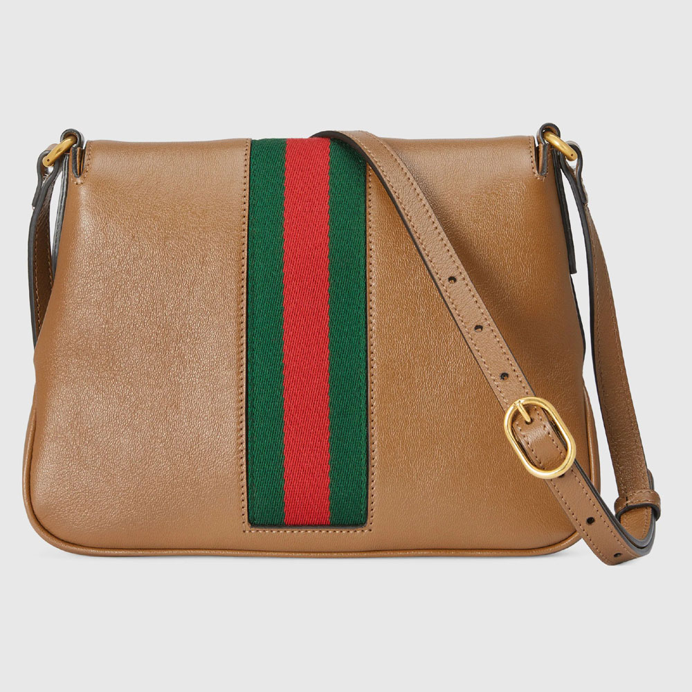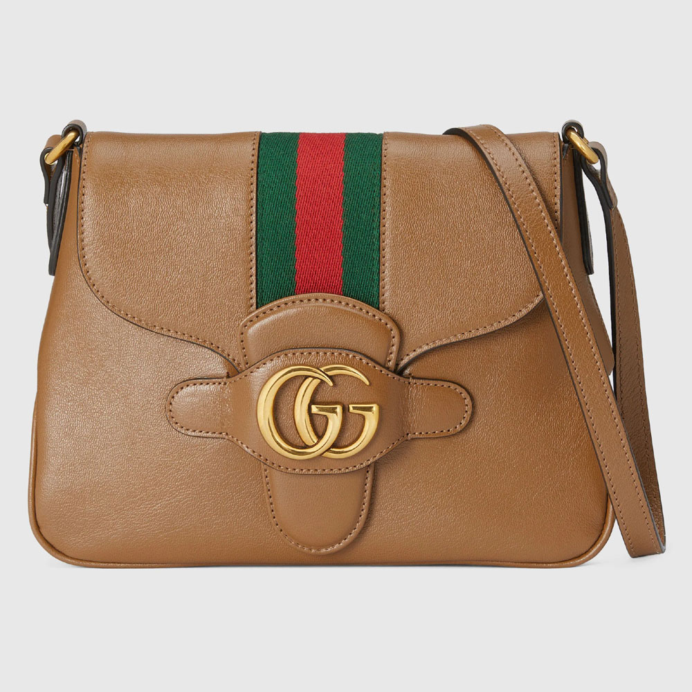 Taken from the 70s archives. the Double G recalls one of the heydays of the House. The hardware first appeared as a monogram belt buckle but has evolved into one of the brand's most emblematic codes. Here. the gold-toned detail defines a messenger bag in beige leather. The logo is paired with the Web stripe. a symbol that recalls the House's equestrian history.