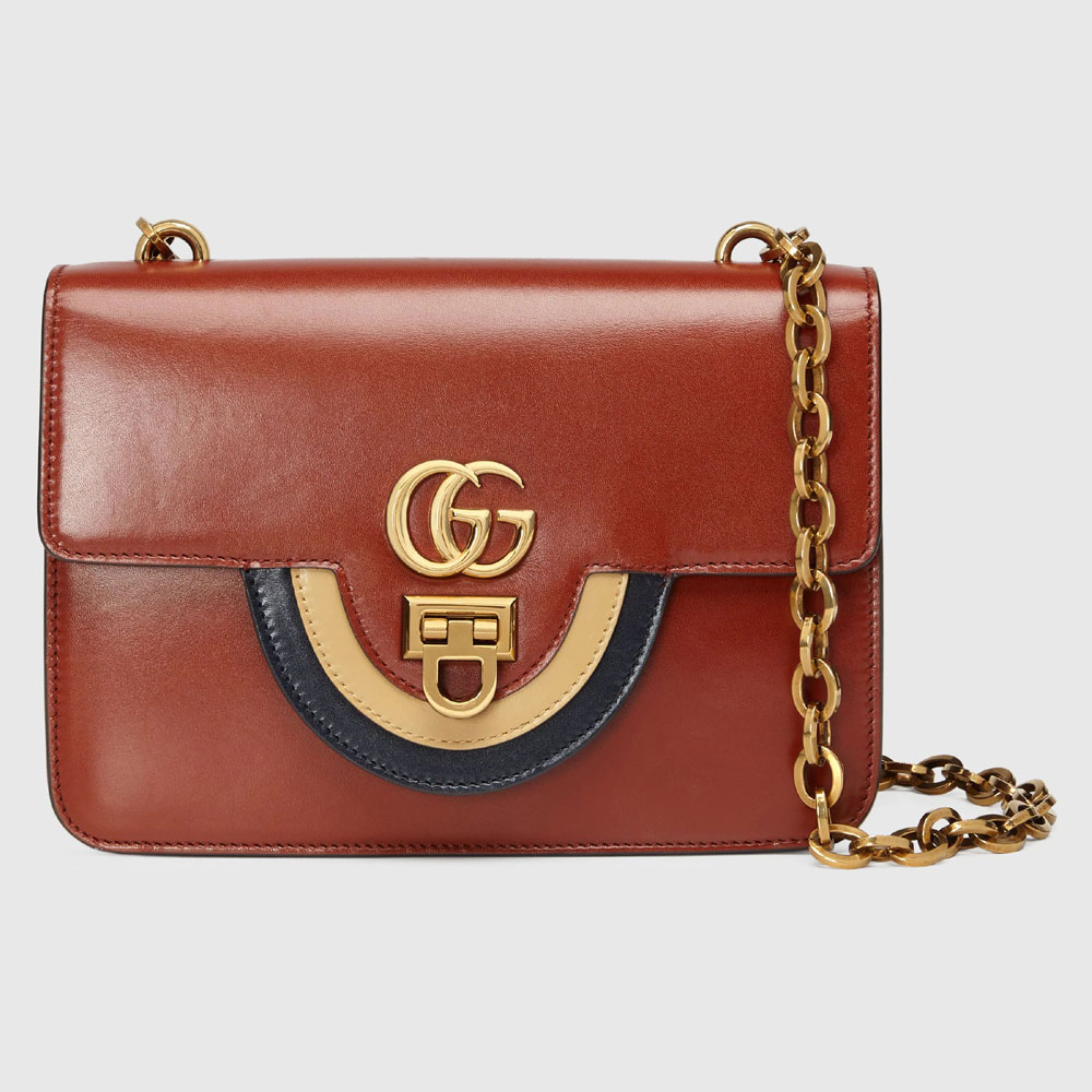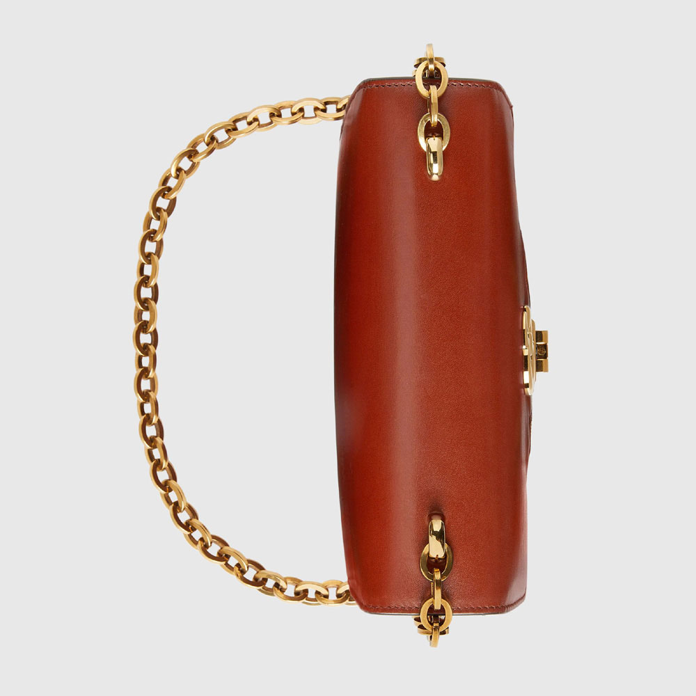 A detail from the 70s archives. the Double G is one of the House's most recognizable codes. Here. the gold-toned hardware defines a structured shoulder bag in brick red leather. Crafted with a structured square shape. a crescent bi-color leather detail infuses the style with a vintage twist.