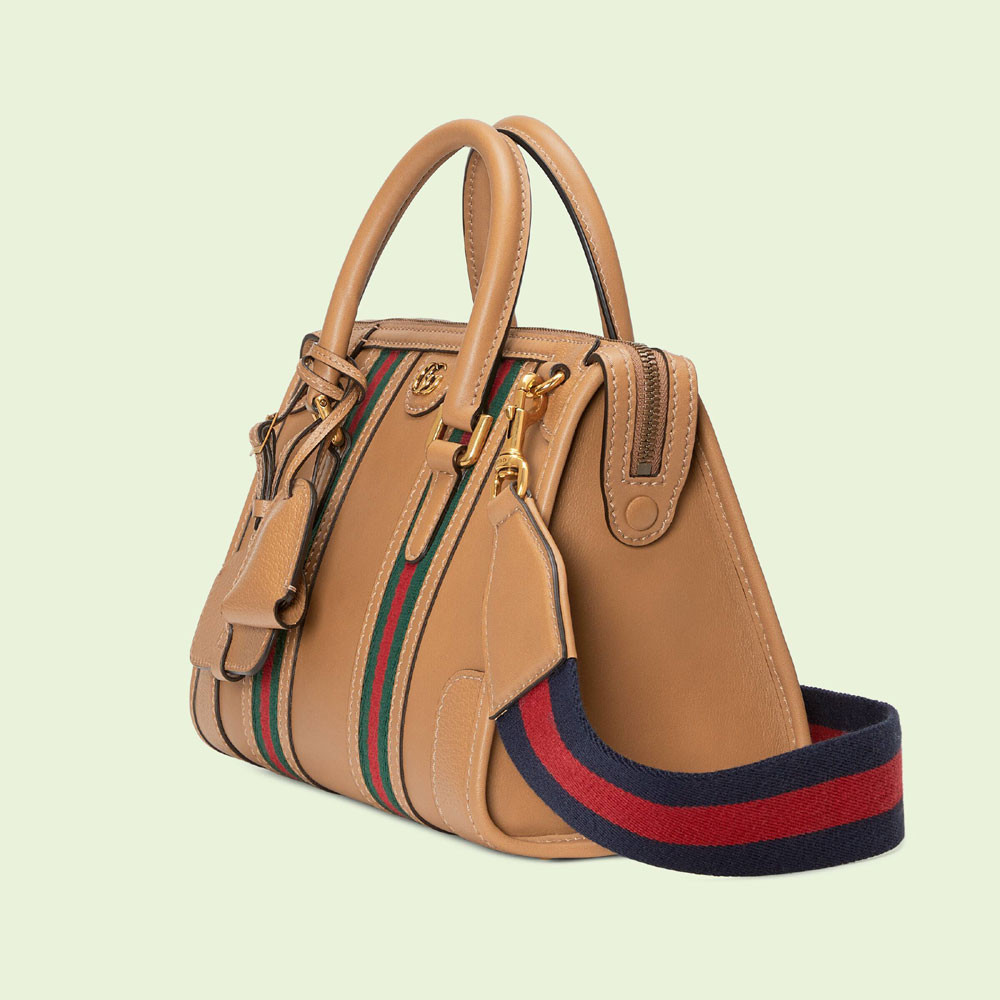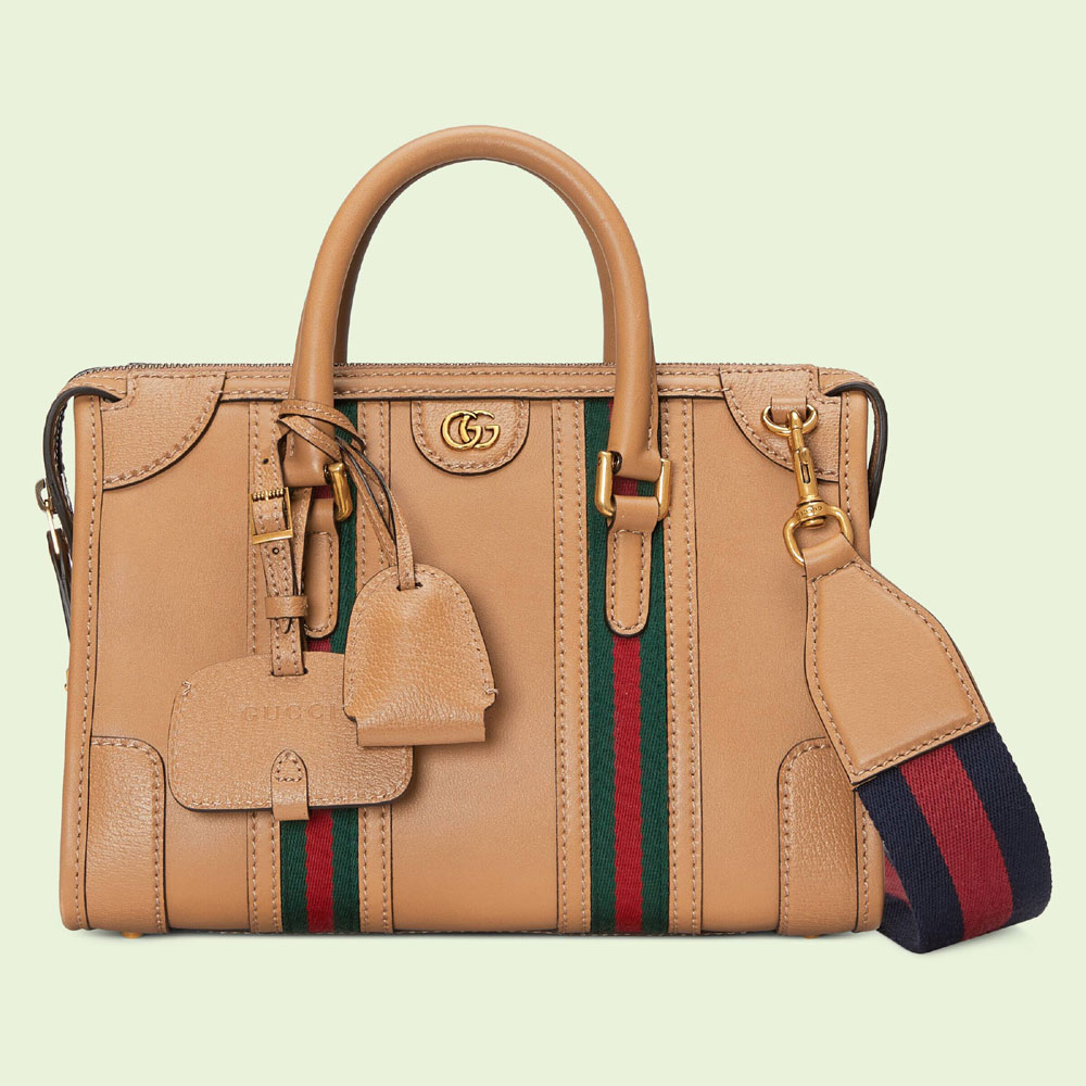The top handle bag is reimagined in a new duffle style. part of the House's latest collection Exquisite Gucci. Crafted in light brown leather. the Web stripe and Double G hardware characterize the silhouette with archival symbols of the House.