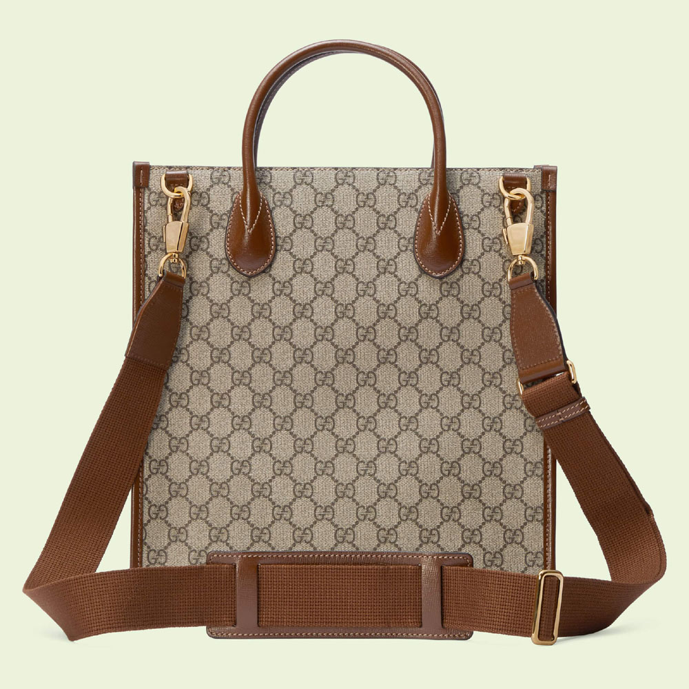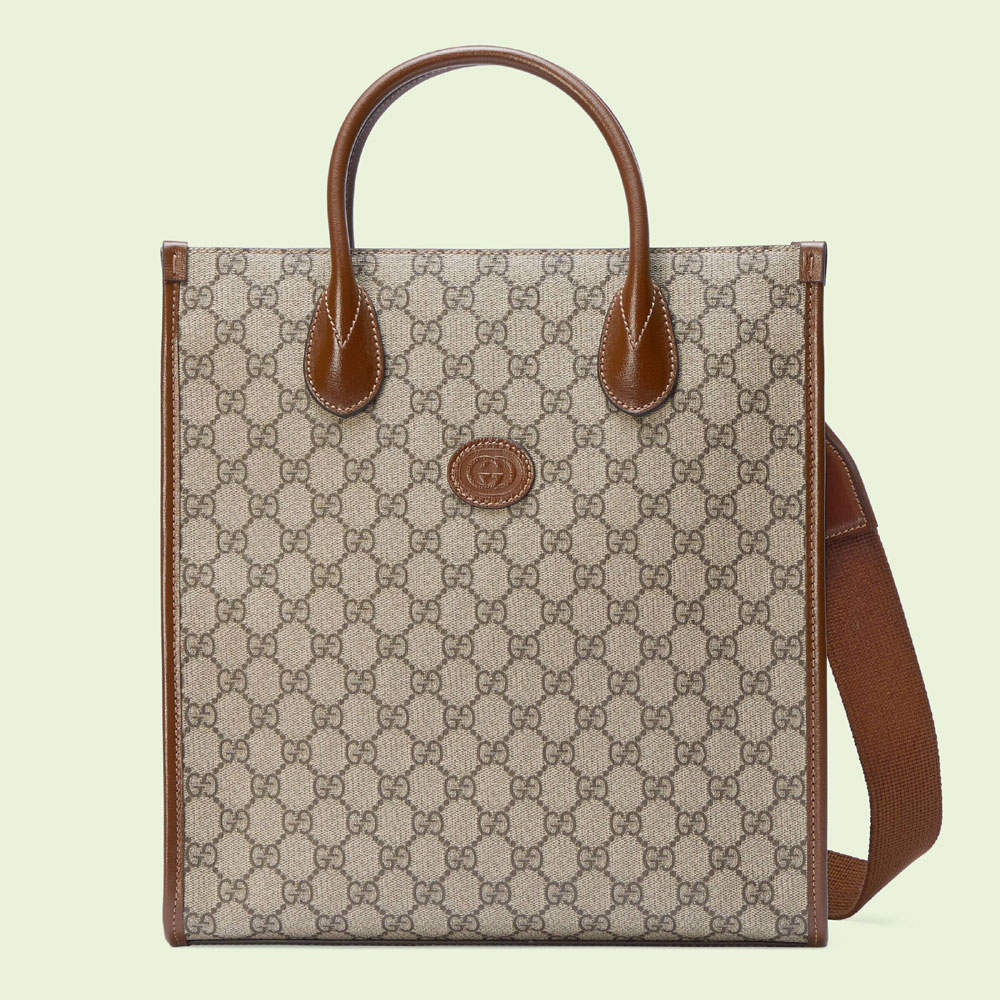The Interlocking G has remained one of the most symbolic codes of the House since its introduction. The distinguishing emblem appears as a leather detail atop this tote bag. Completing the design's logo feel. the style is crafted from beige and ebony monogram canvas.
