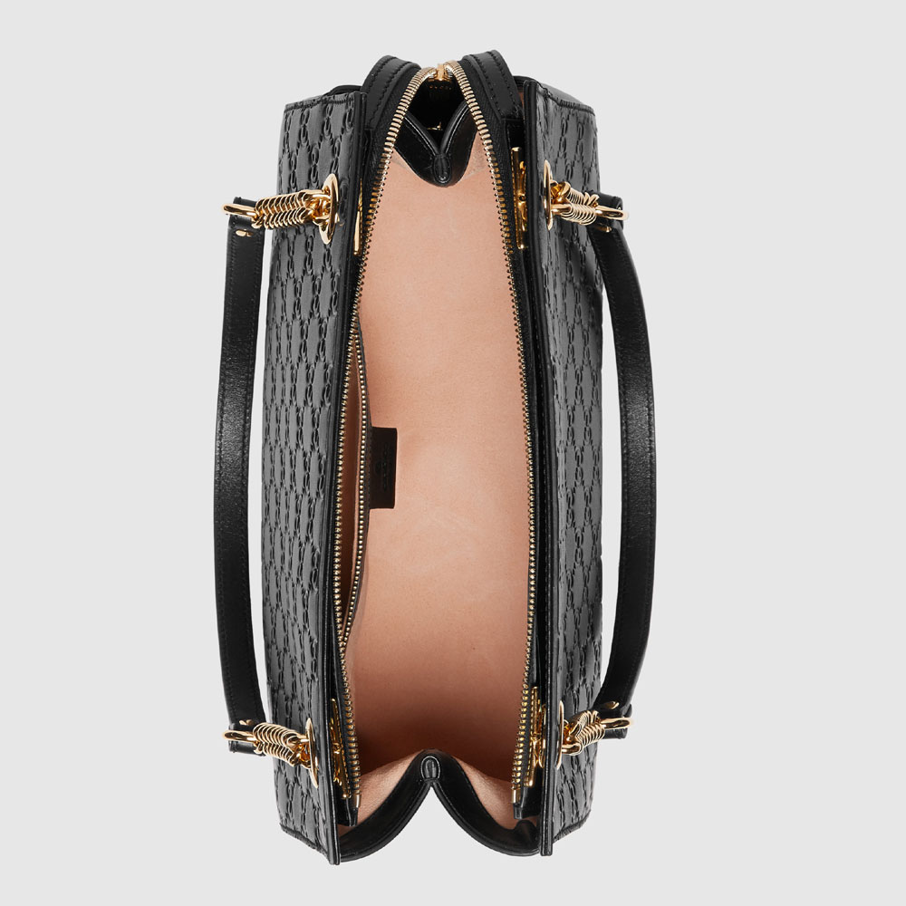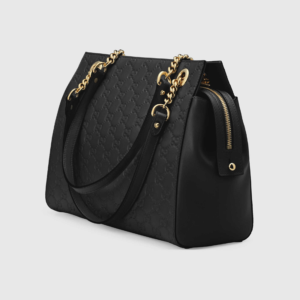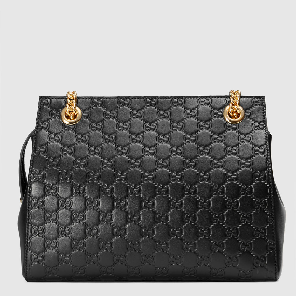 A medium shoulder bag with a softly structured shape. The chain straps have a leather shoulder detail. Made in heat debossed soft Gucci Signature leather with a defined print and firm texture-an update to the classic Gucci Signature leather with a softer construction.