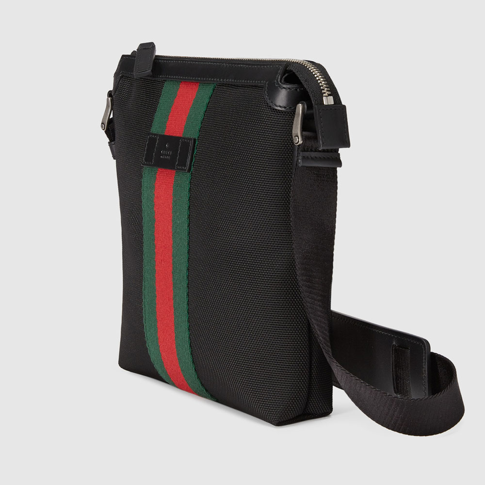 First developed by Gucci in the 1950s, the Web stripe continues to pay homage to the House's roots. The equestrian inspired detail is found on a small flat messenger bag in techno canvas.