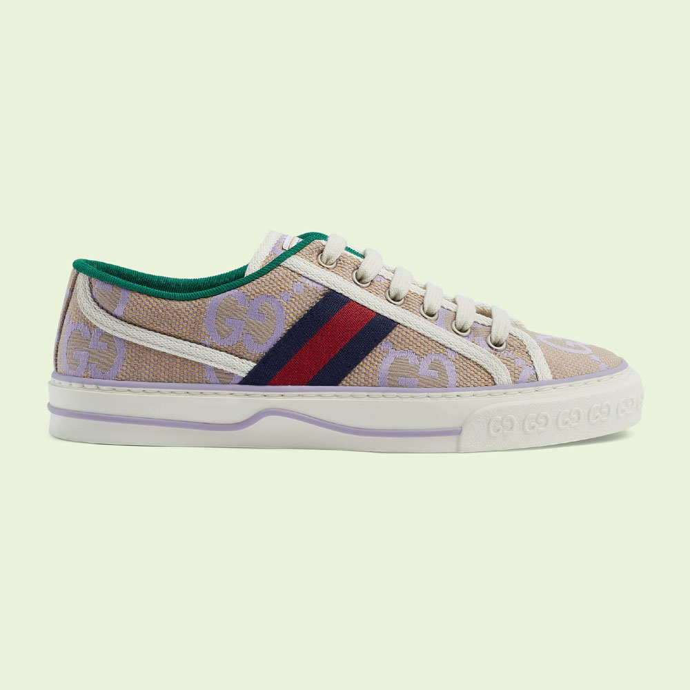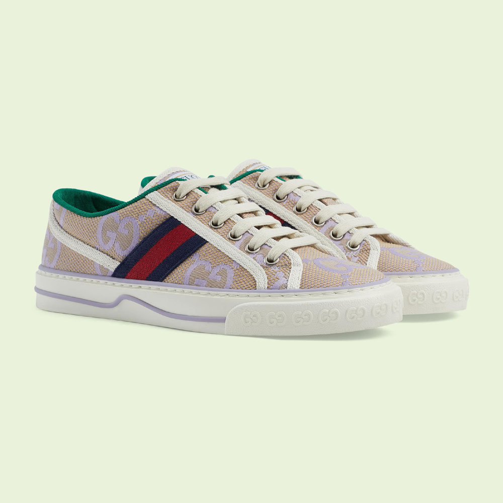 A variation on a classic. this Gucci Tennis 1977 sneaker is presented in a beige and lilac jumbo GG canvas. The blue and red Web stripe decorates the side of the shoe. enhancing the style's logo feel.