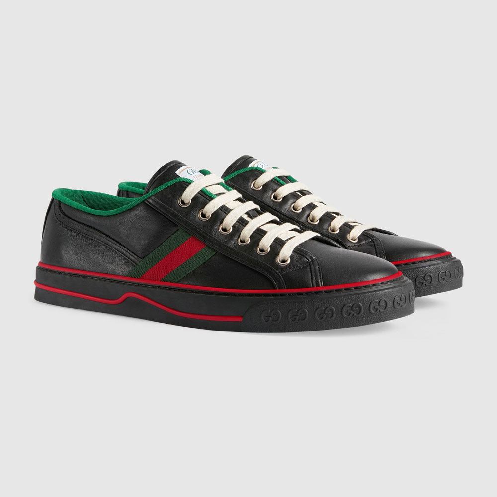 The Gucci Tennis 1977 is reimagined in black leather. With a low-top shape. the shoe combines different elements from the Houses heritage such as a label with the line name. a textured GG motif at the sole and the classic Web.These logo details add a vintage feel to the style while recalling the Houses connection to the world of sports and leisure.
