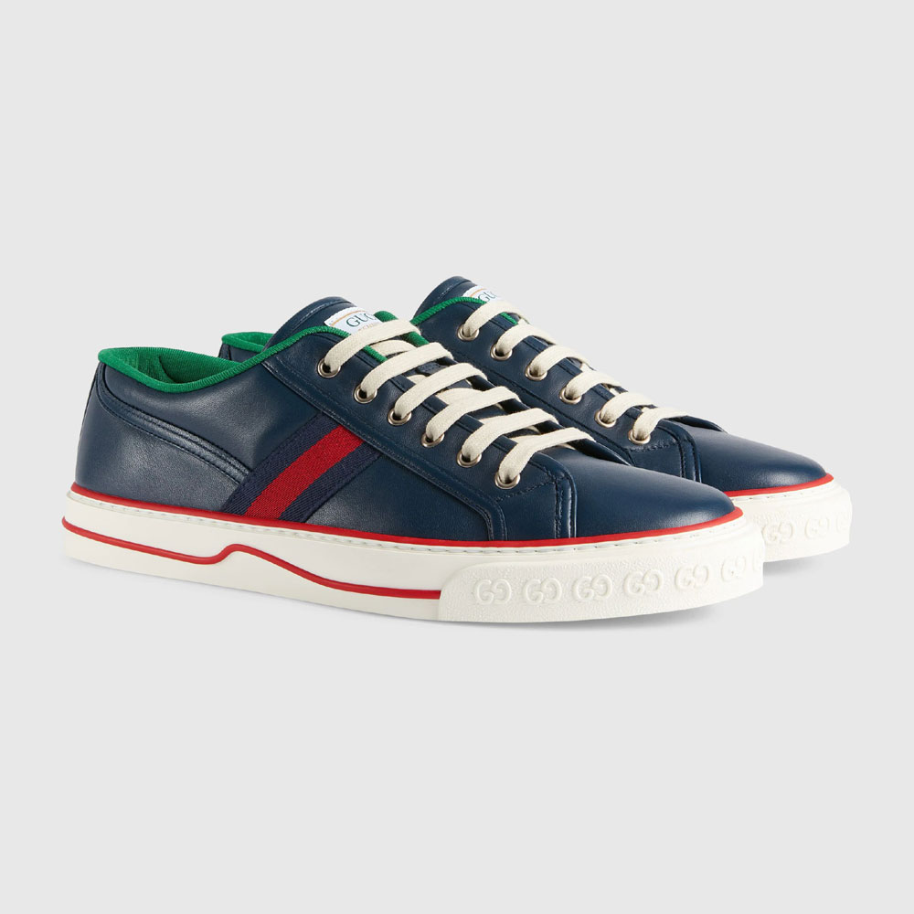The Gucci Tennis 1977 is reimagined in navy leather. With a low-top shape. the shoe combines different elements from the Houses heritage such as a label with the line name. a textured GG motif at the sole and the classic Web.These logo details add a vintage feel to the style while recalling the Houses connection to the world of sports and leisure.