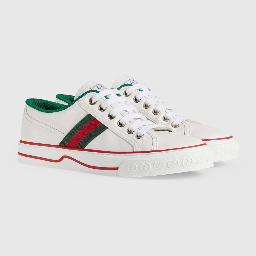 The Gucci Tennis 1977 is reimagined in white leather. With a low-top shape. the sneaker is crafted from cotton canvas and decorated with a playful polka dot motif featuring the Double G logo. The shoe combines different elements from the Houses heritage such as a label with the line name. a textured GG motif at the sole and the classic Web details which add a vintage feel to the style while recalling the Houses connection to the world of sports and leisure.