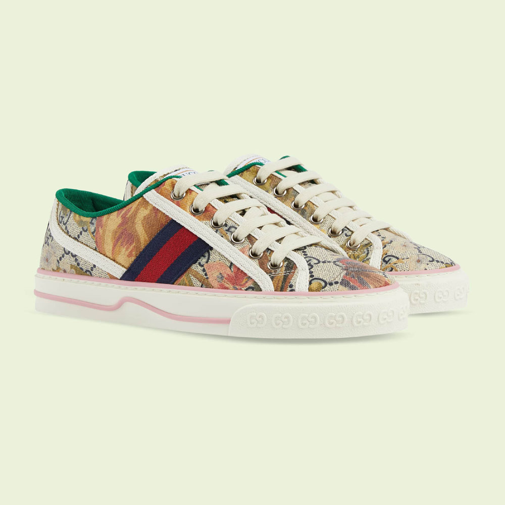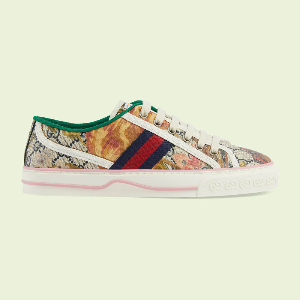 The historical Flora motif from the 1960s was designed by artist Vittorio Accornero. The floral pattern enriches this pair of sneakers with a romantic nature. appearing as a multicolored print atop the GG motif.