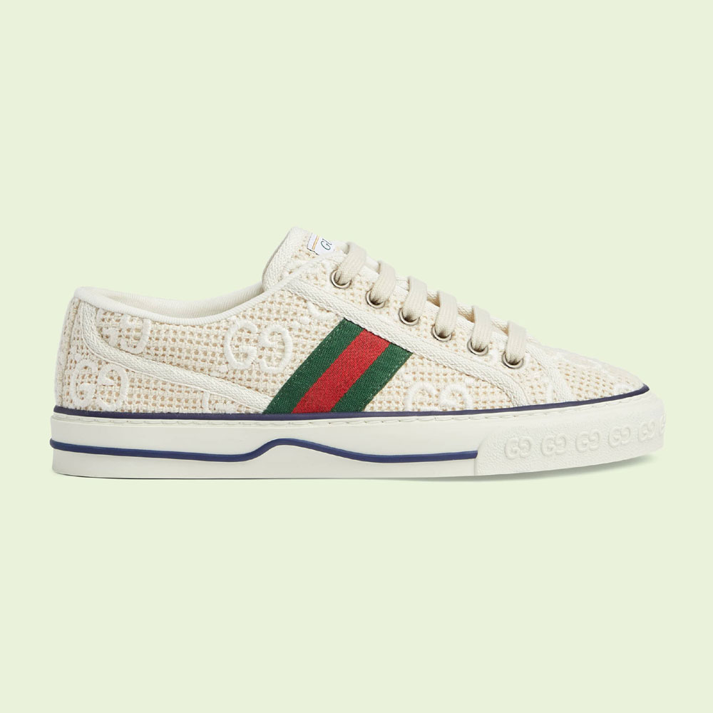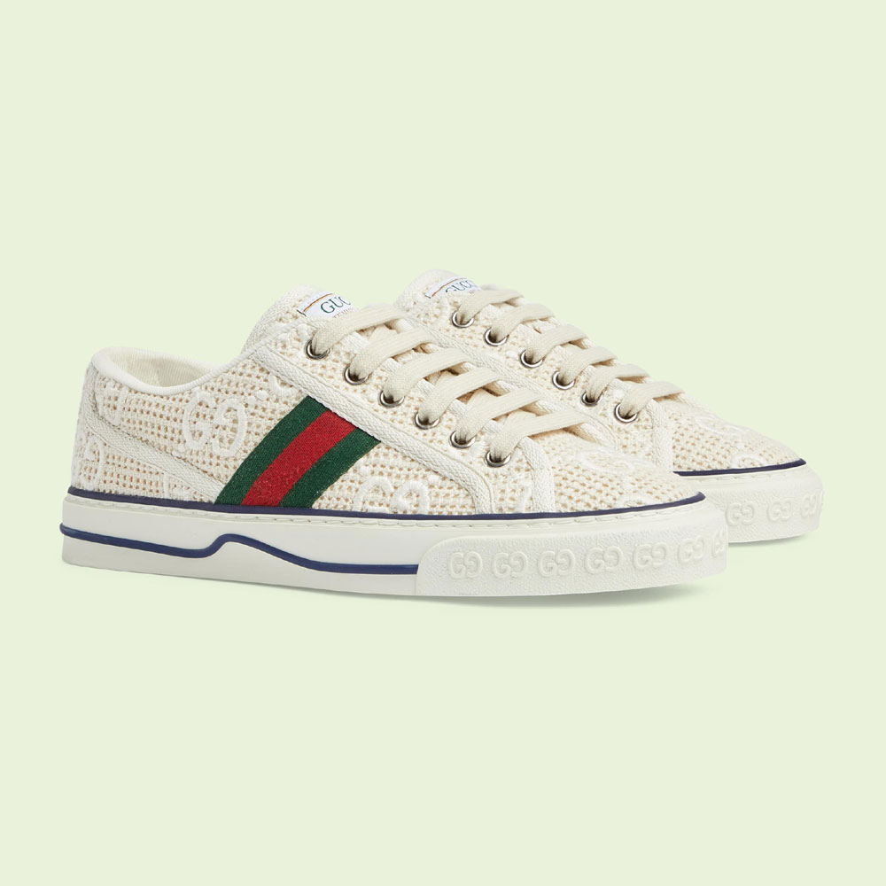 First used in the 1970s. the GG logo was an evolution of the original Gucci rhombi design from the 1930s. and from then it's been an established symbol of the House's heritage. Here. the pattern defines this pair of Gucci Tennis 1977 sneakers presented in ivory GG embroidered crochet cotton. Deepening the connection to the brands' heritage. Guccio Gucci's initials also appear as a raised motif at the sole.