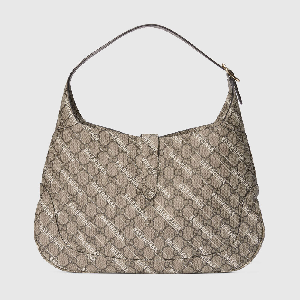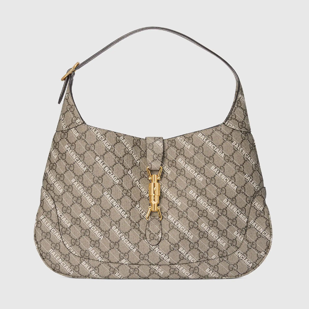 Exploring ideas of authenticity and appropriation within the fashion industry. Gucci Aria unveils The Hacker Project. In his latest collection. Alessandro Michele in expressions of homage infuses iconic Balenciaga silhouettes with Gucci codes in unique creations. Presented as a part of the selection. the Jackie 1961 shoulder bag is reimagined in Balenciaga print GG Supreme canvas. Size:37 x 24 x 5CM