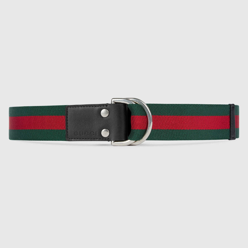 Gucci Web strap in green and red with D-ring closure.