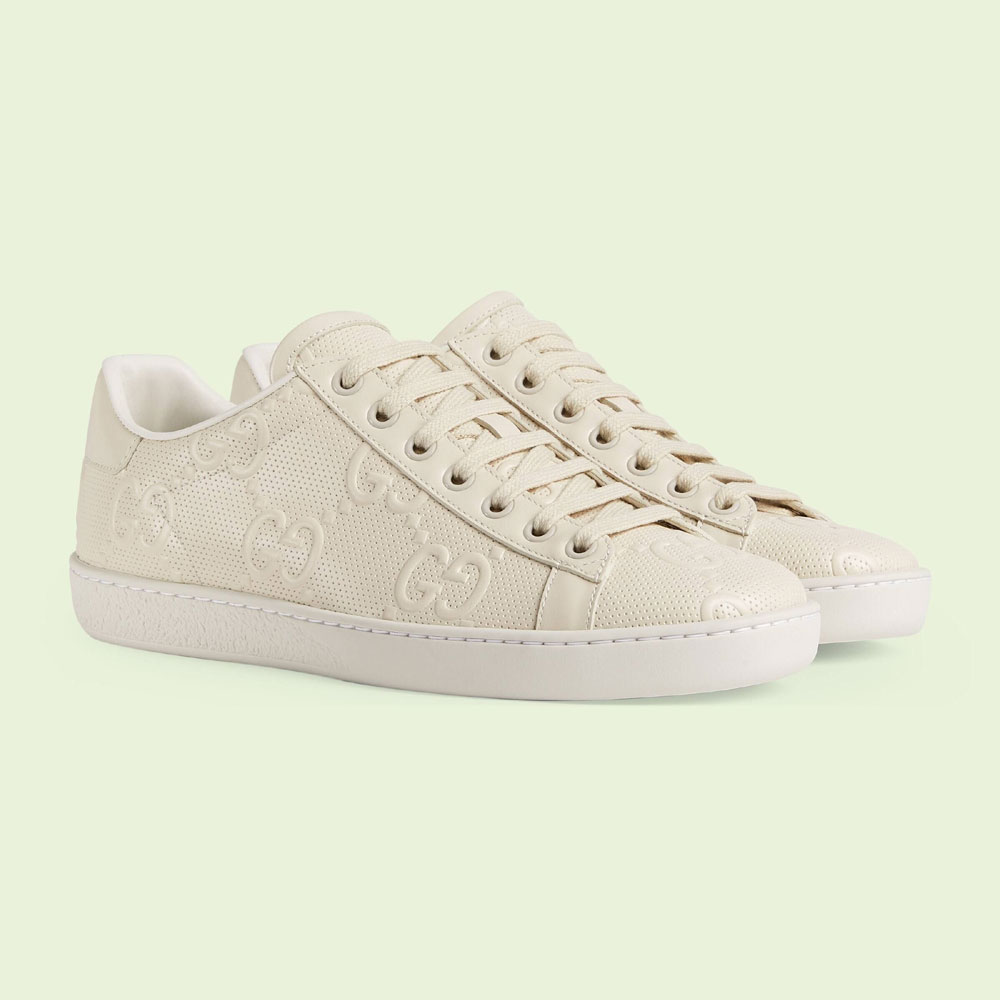 The Ace sneaker's streamlined silhouette is enhanced with a strong logo feel . Crafted from white GG leather. noted for its softness and slightly shiny finish-the leather plays with texture. embossing the House emblem onto a perforated base.
