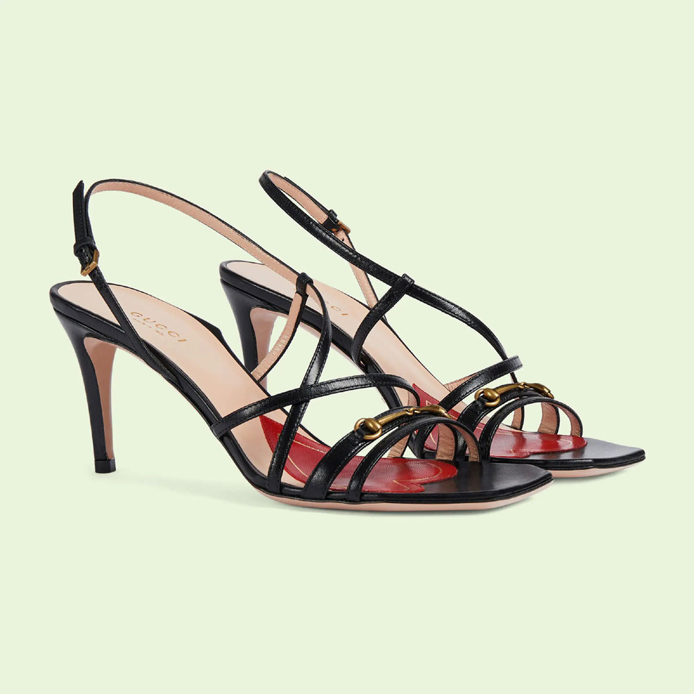 Retro shapes and silhouettes frame designs with an early 2000s aesthetic. This pair of open toe sandals are presented with a square-shape toe. thin straps and a low-heel. Highlighted by smooth black leather. a narrow version of the Horsebit appears at the front as a subtle logo detail.