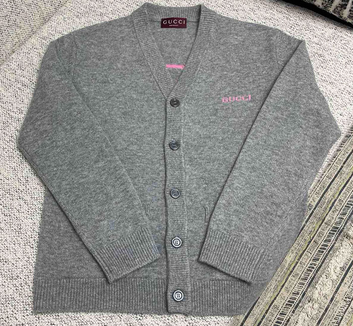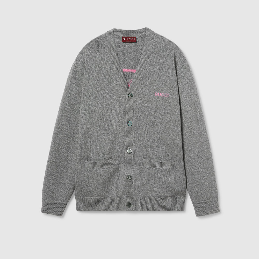 Gucci Wool Cashmere Cardigan in Grey offers a sophisticated base for versatile menswear looks. Pair it with a crisp white crewneck tee and slim-fit black trousers for polished minimalism. Highlight the intarsia's vibrant pink accents by layering over a gucci floral clothing button-up shirt left unbuttoned. For casual flair, style with lightwash denim jeans and leather sneakers in matching grey tones.