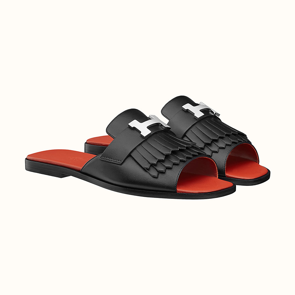 Sandal in calfskin with fringe detail and palladium plated signature "H" detail.