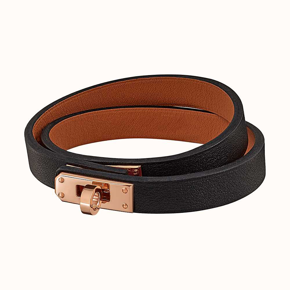 Double tour bracelet in Swift calfskin with rose gold plated mini Kelly closure.