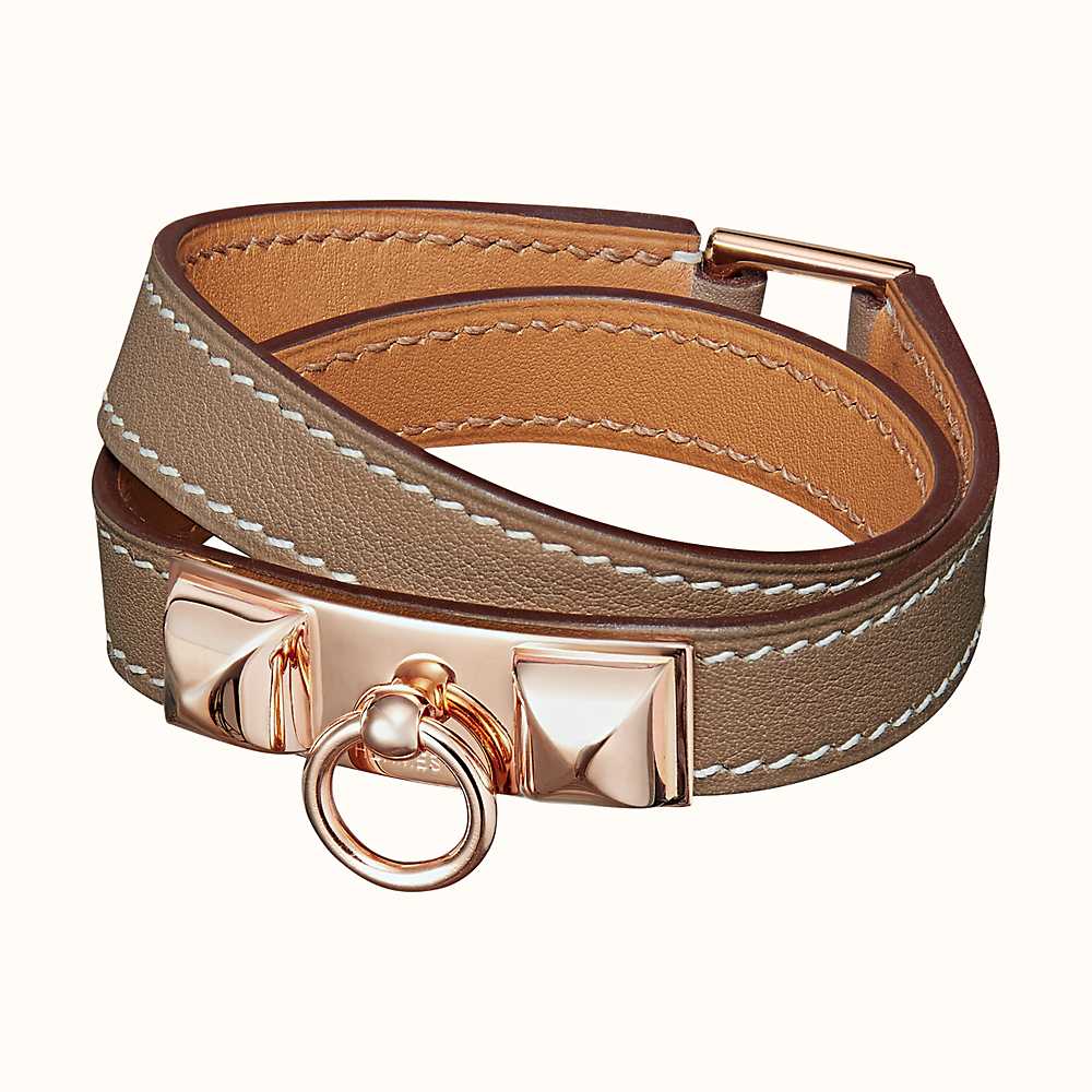 Double tour bracelet in Swift calfskin with rose gold plated Medor pyramid studs and ring.