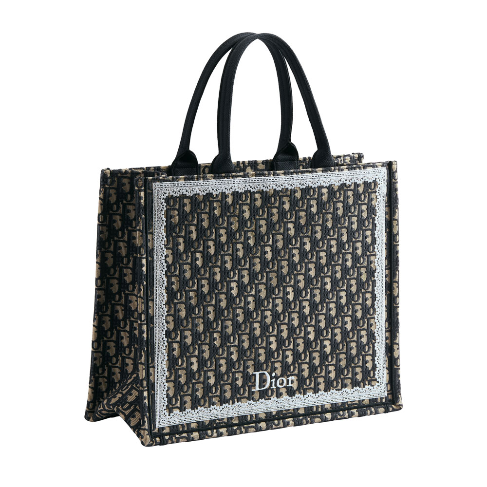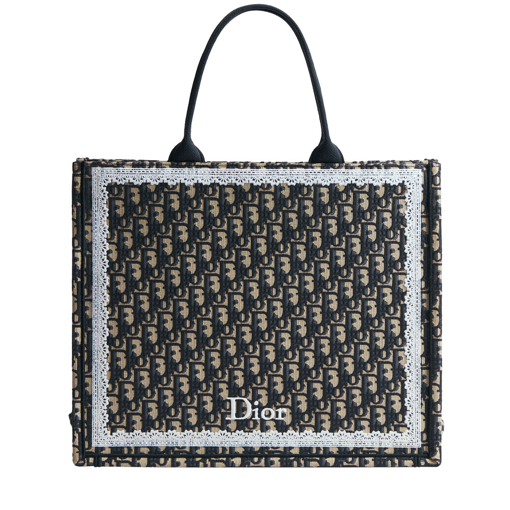 This redesigned Dior Book Tote features elegant Dior Oblique embroidery, accented with lace detailing and a stylish bow. The spacious design includes: