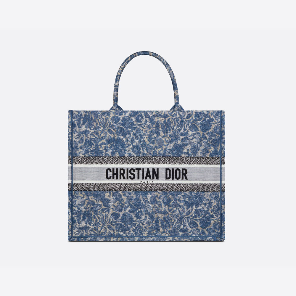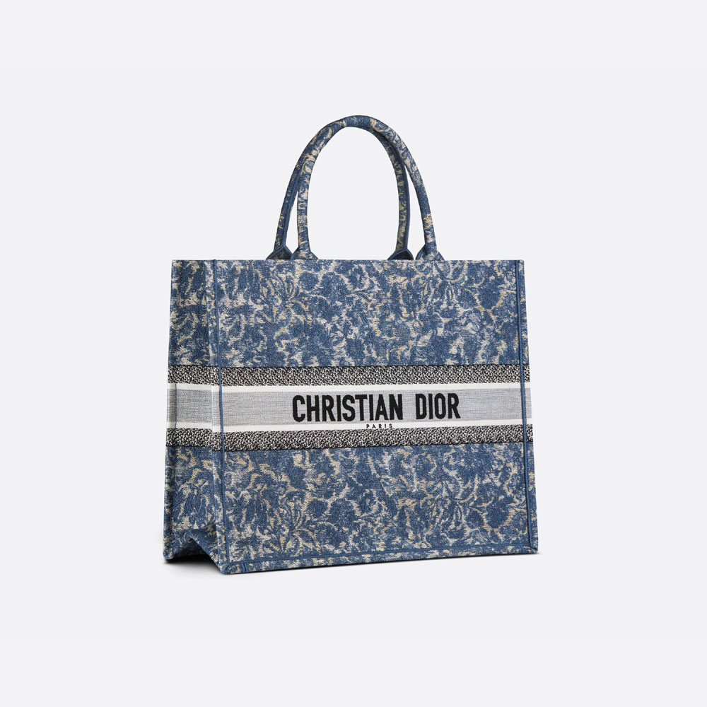 The Dior Book Tote is an original creation introduced by Maria Grazia Chiuri. Dior's Creative Director. and has become a staple of the Dior aesthetic. Designed to hold all the daily essentials. it is fully embroidered with the blue Dior Brocart motif with a denim effect. offering a new take on House codes. Adorned with the 'CHRISTIAN DIOR PARIS' signature on the front. the large tote exemplifies the House's signature savoir-faire and may be carried by hand or worn over the shoulder.