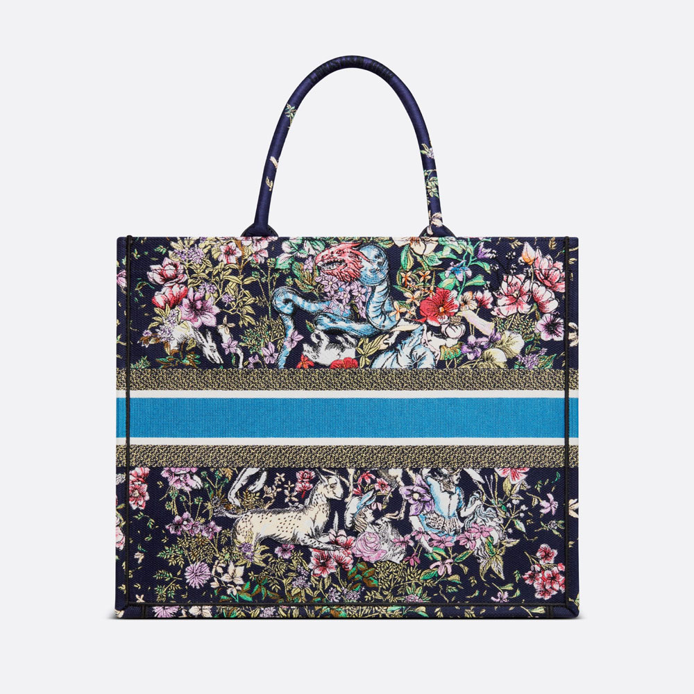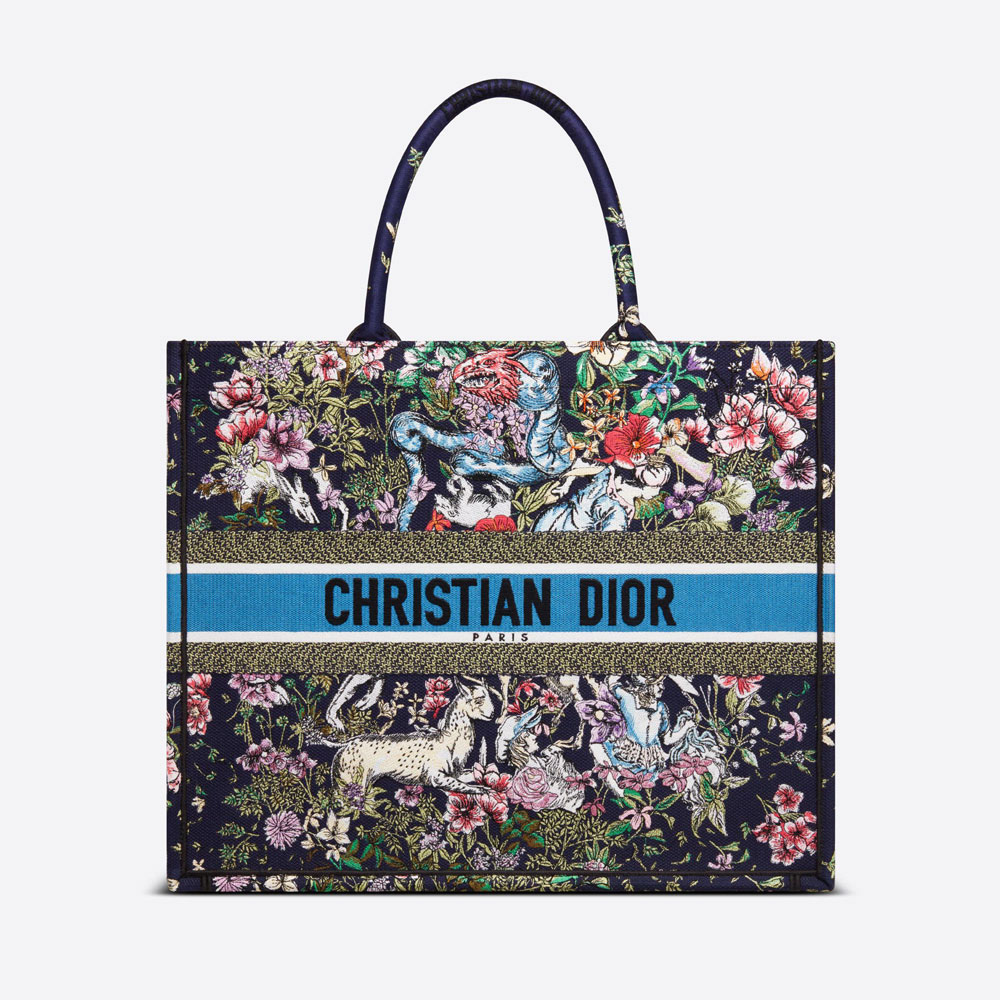 Introduced by Maria Grazia Chiuri. Creative Director of Christian Dior. the Dior Book Tote has become a staple of the Dior aesthetic. Designed to hold all the daily essentials. the style is fully embroidered with a blue multicolor D-Constellation motif inspired by Mr. Dior's passion for astrology. Adorned with the 'CHRISTIAN DIOR PARIS' signature on the front. the large tote exemplifies the House's signature savoir-faire and may be carried by hand or worn over the shoulder.