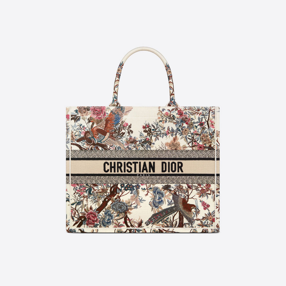 Introduced by Maria Grazia Chiuri. Dior's Creative Director. the Dior Book Tote has become a staple of the Dior aesthetic. Designed to hold all the daily essentials. the style is fully embroidered with an ecru multicolor Dior Jardin d'Hiver motif. showcasing a poetic and exotic interpretation of Mr. Dior's wall tapestries. Adorned with the 'CHRISTIAN DIOR PARIS' signature on the front. the large tote exemplifies the House's signature savoir-faire and may be carried by hand or worn over the shoulder.