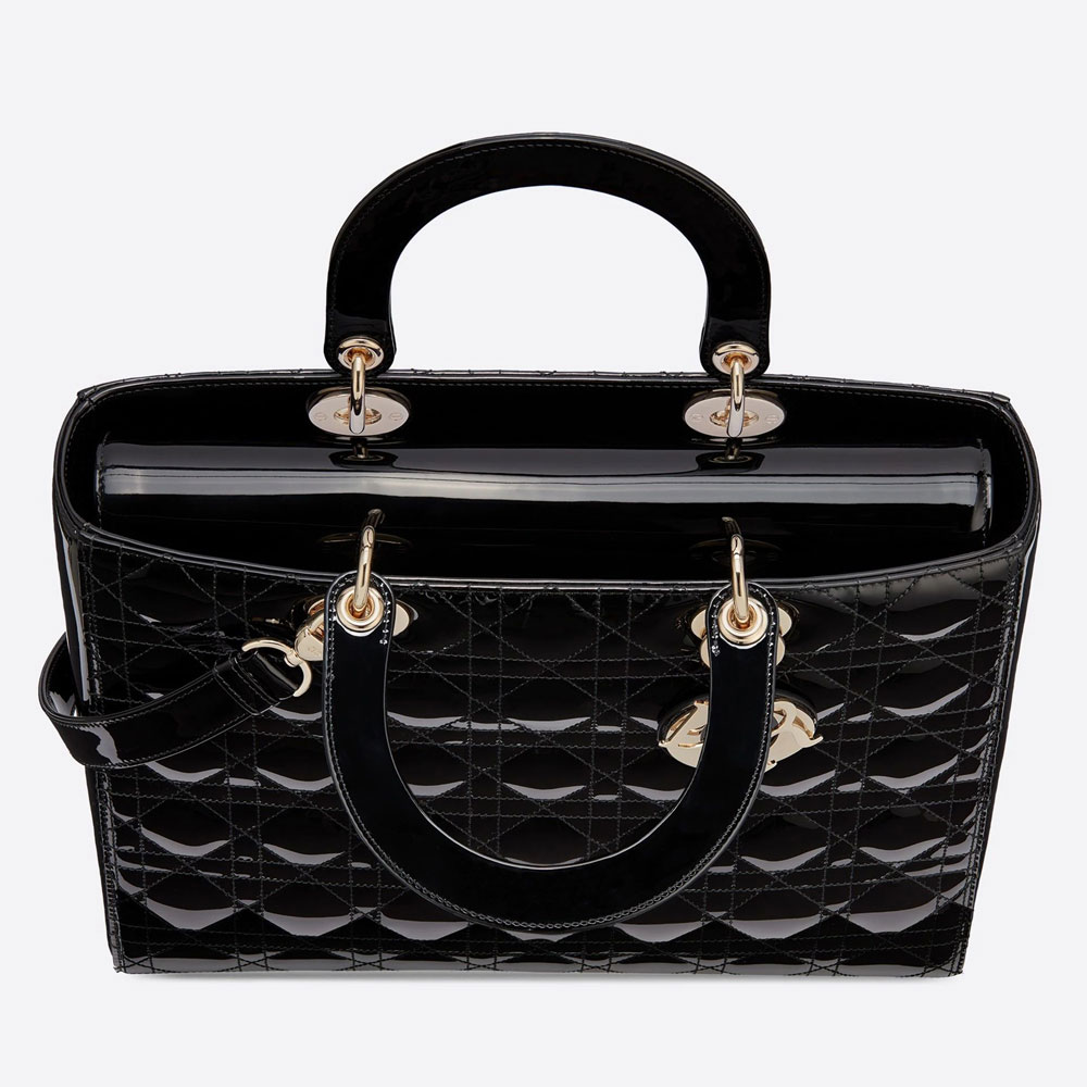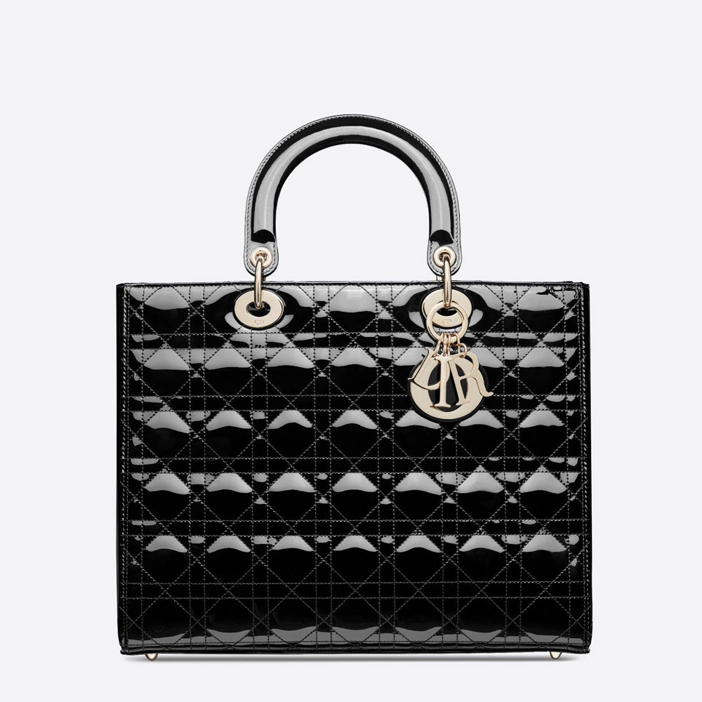 The Lady Dior bag epitomizes Diors vision of elegance and beauty. Refined and sophisticated, the timeless yet relevant style is crafted in black patent calfskin with Cannage stitching, creating the instantly recognizable quilted texture. The pale gold-finish metal D.I.O.R. charms further embellish the silhouette. The large Lady Dior bag has a tonal adjustable leather shoulder strap.