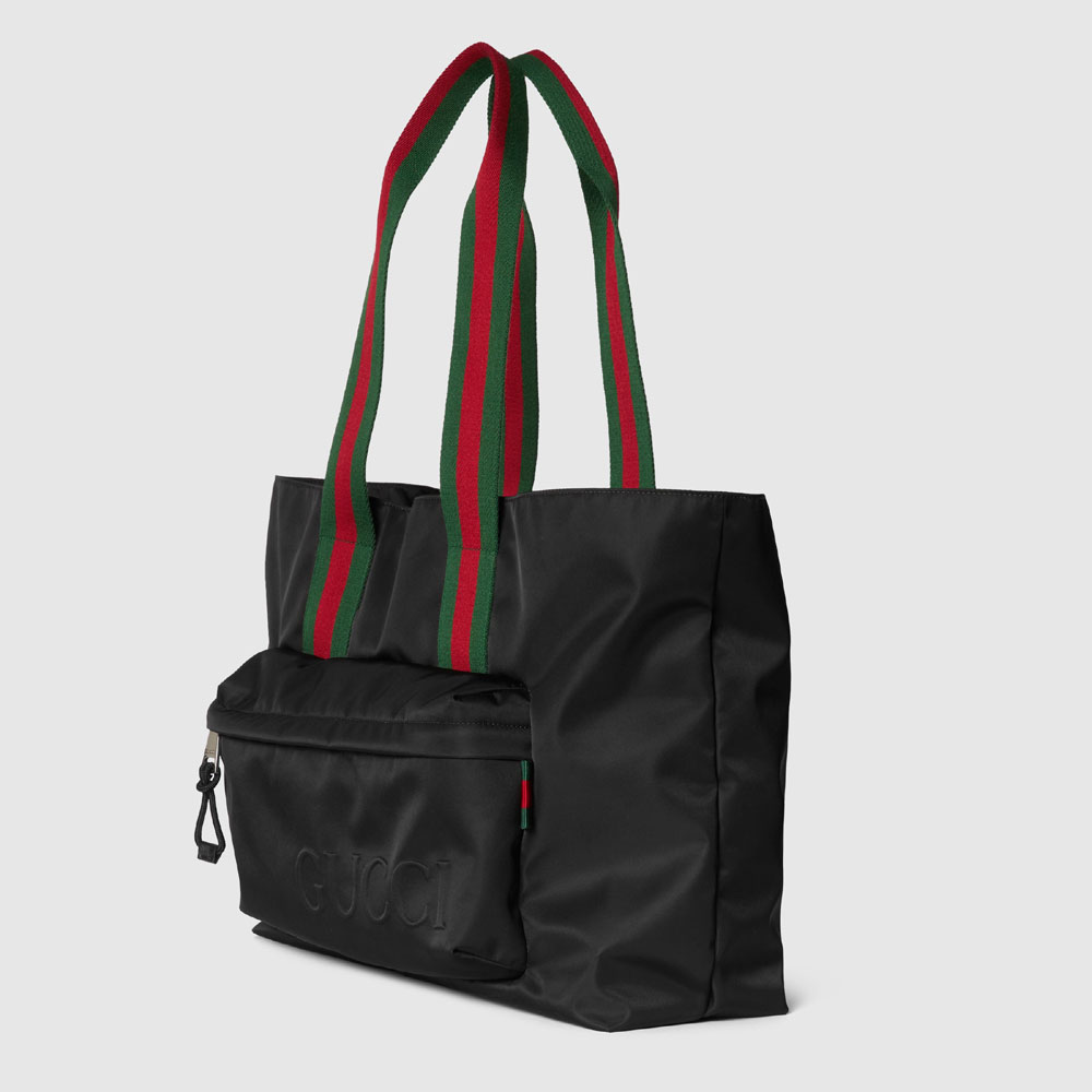 Introduced on the men's Fall Winter 2024 runway, tote bags blend sleek lines with a sporty attitude. This large version in soft yet resistant black nylon provides a sophisticated backdrop for the subtle Gucci logo in relief, created with a high frequency embossing technique. Other iconic details include a green and red Web handles and a Web detail on the front.