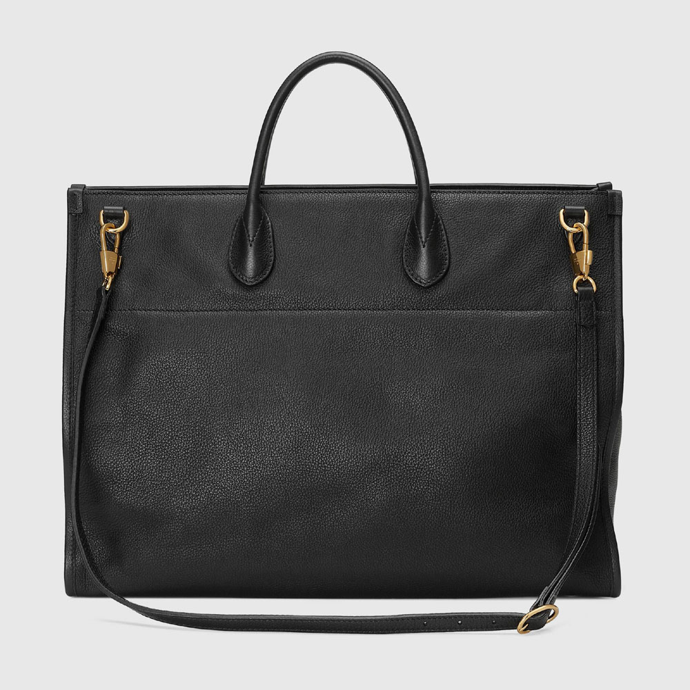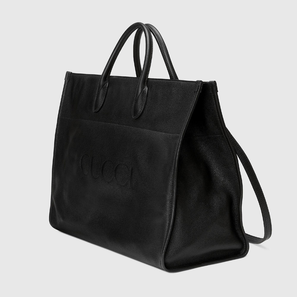 Subtle logo touches add a minimalist feel to classic shapes and silhouettes. Here. this black leather tote bag is defined by an embossed version of the Gucci logo.