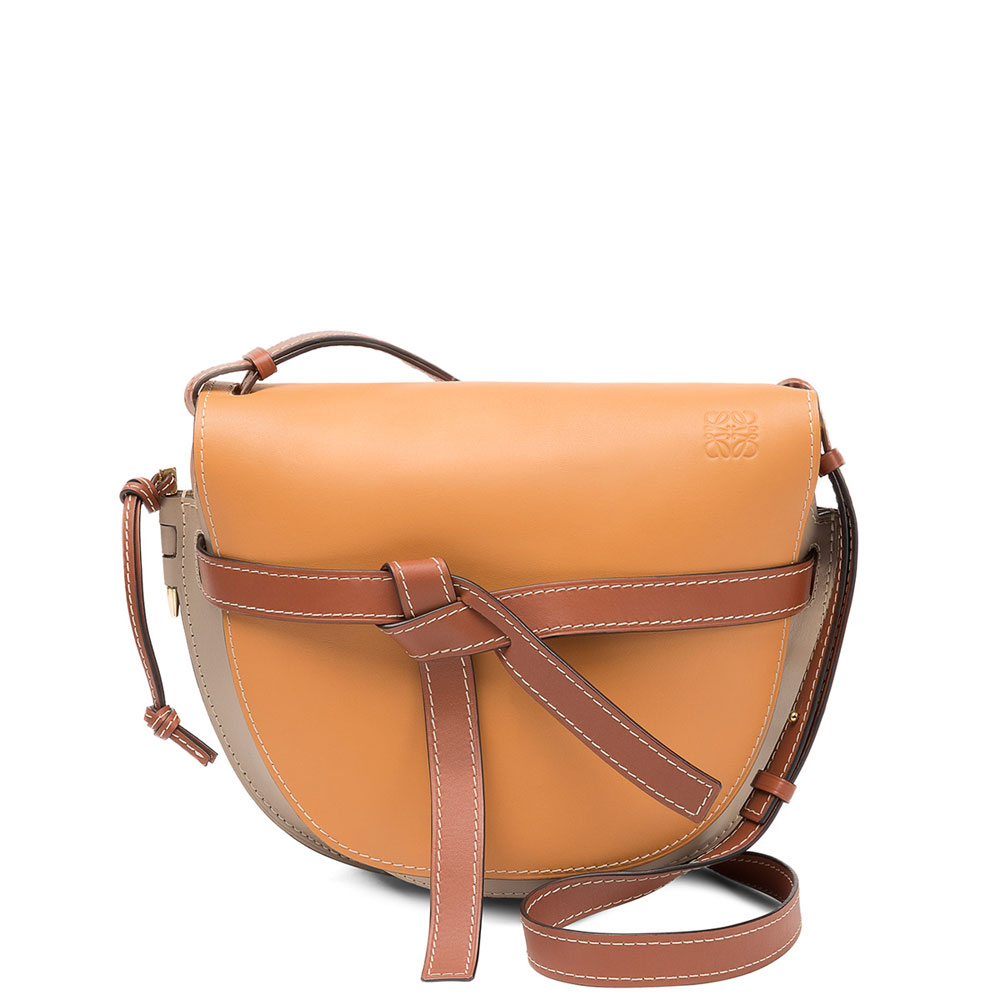 Saddle-shaped crossbody bag, timeless functionality reimagined in a contemporary way due to its refined and sleek construction. Gate bag owes its name to its side latched metallic pin with a flirty dangling leather strip and its knotted front belt bow closure. Gate perfectly embodies LOEWEs artisanal savoir faire with a new sensibility, skillfully handcrafted from high-end leathers, designed to wear beautifully over time. Key features: crafted from Soft Calfskin, front flap pulls in under to knotted belt for secure fastening, bonded Gold Suede lining, interior compartments with a dividing slot, back large slit pocket, Black hand-painted edges, adjustable shoulder strap with cufflinks, embossed Anagram to tone.