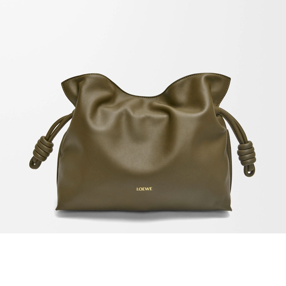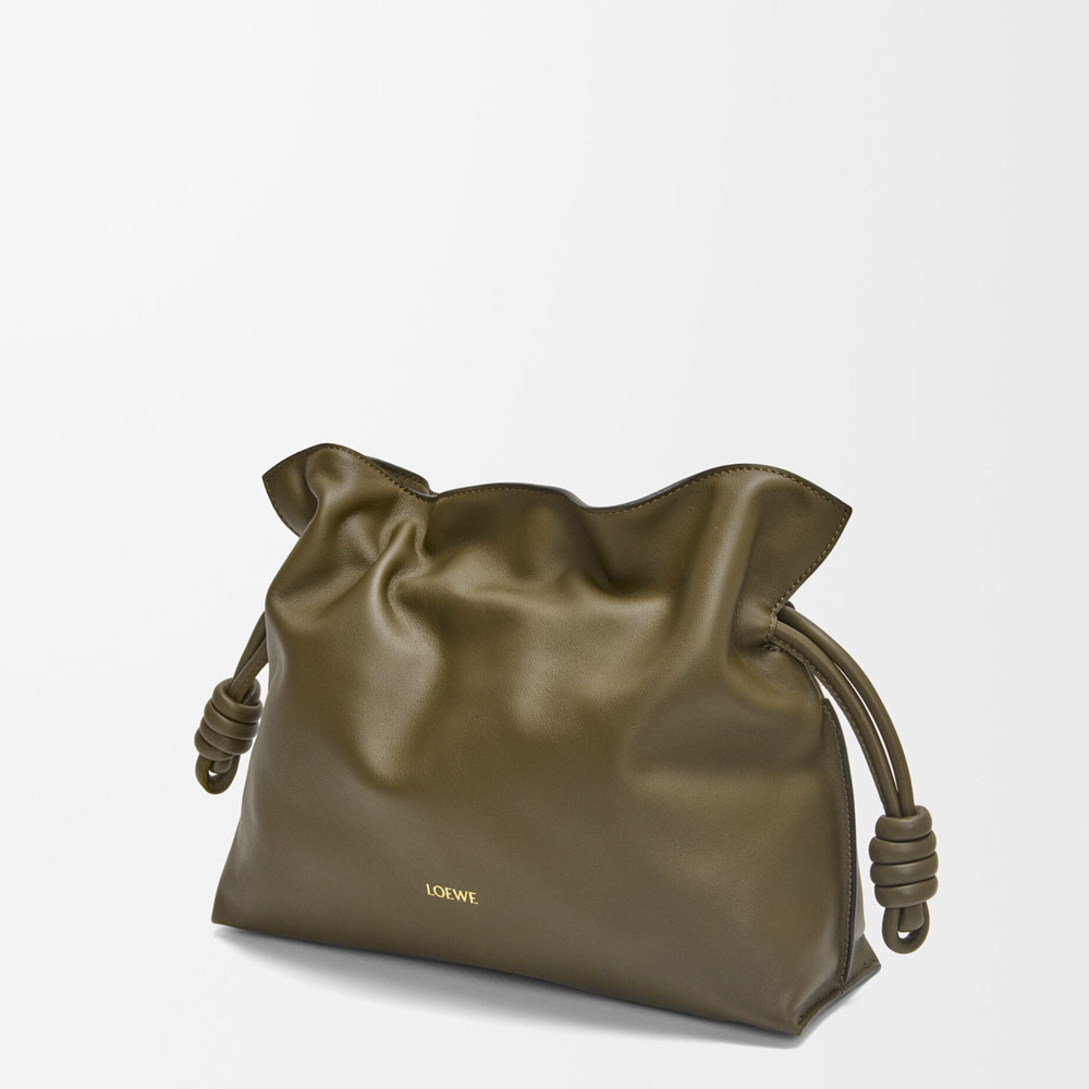 The Loewe Medium Flamenco Clutch in lush green nappa calfskin is a chic complement to effortless elegance. Pair it with a neutral-toned tailored blazer and slip dress for polished daytime attire, or let it pop against a little black dress for evening sophistication.