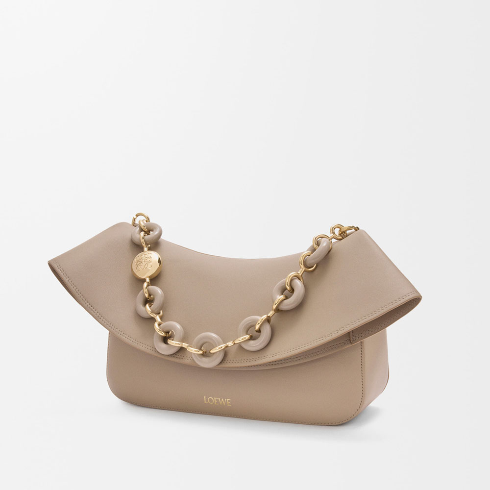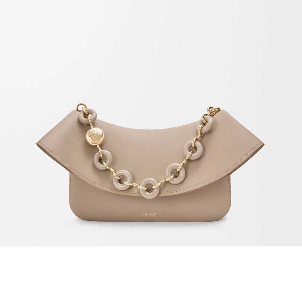 The bag's detachable chain adds flair to evening ensembles-try it with a silk slip dress or a structured blazer. As a Loewe crossbody bag, it's perfect for hands-free ease. The smooth calfskin and gold detailing complement earth tones, pastels, or monochrome outfits, making it a timeless staple.