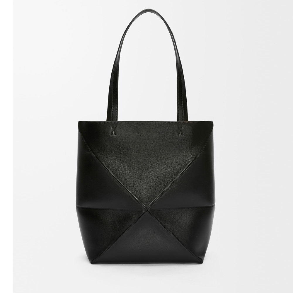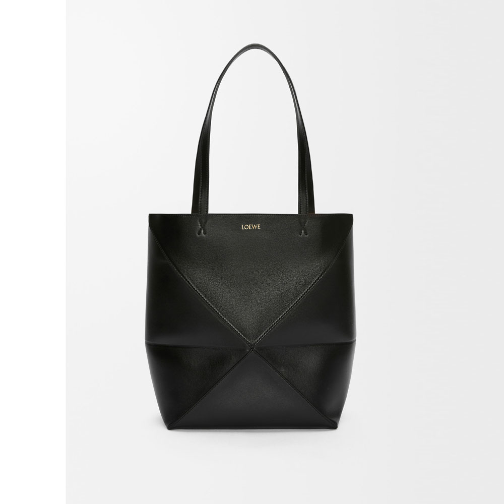 The Loewe Fold Tote in glossy black calfskin is a versatile accessory perfect for elevating everyday looks. Pair it with a crisp white blouse, tailored black trousers, and heeled boots for polished office attire.