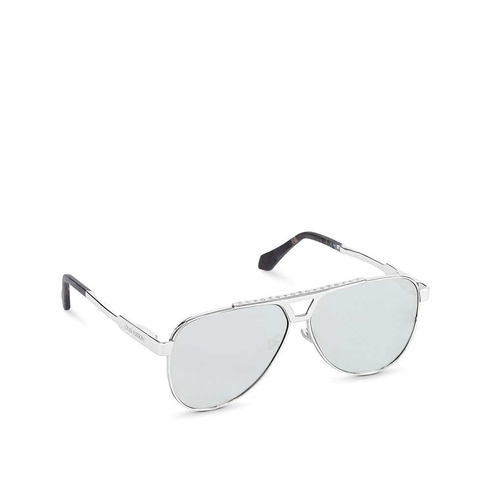 The 1.1 Evidence Metal Pilot Sunglasses make a comeback for Fall-Winter 2022. reimagined with light frames for a fresh look. House details include a Louis Vuitton signature at the temple and a Monogram pattern engraving on the top bar. Flat mirror lenses give the design an ultra-modern look.