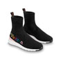 The Aftergame sneaker boot is a cutting-edge hi-top in black stretch textile. The rainbow-colored Vuitton signature embroidered on the side was inspired by the New Wave handbag. This supple. lightweight sneaker is finished with a white rubber outsole embossed with Louis Vuitton's emblematic Malletage pattern.