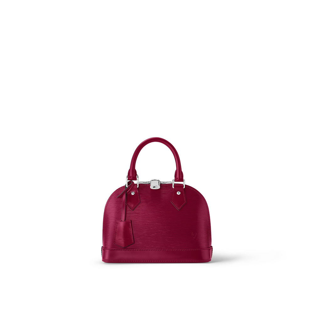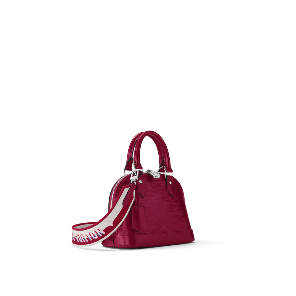 This Alma BB handbag is made from in raspberry-red Epi leather. with its unique textured pattern. Inside. the microfiber lining is in a contrasting color. The wide strap. with Louis Vuitton woven into the textile. brings a sporty carry option. Its instantly identifiable shape and hand-stitched rolled-leather top handles make this bag an eternal classic.