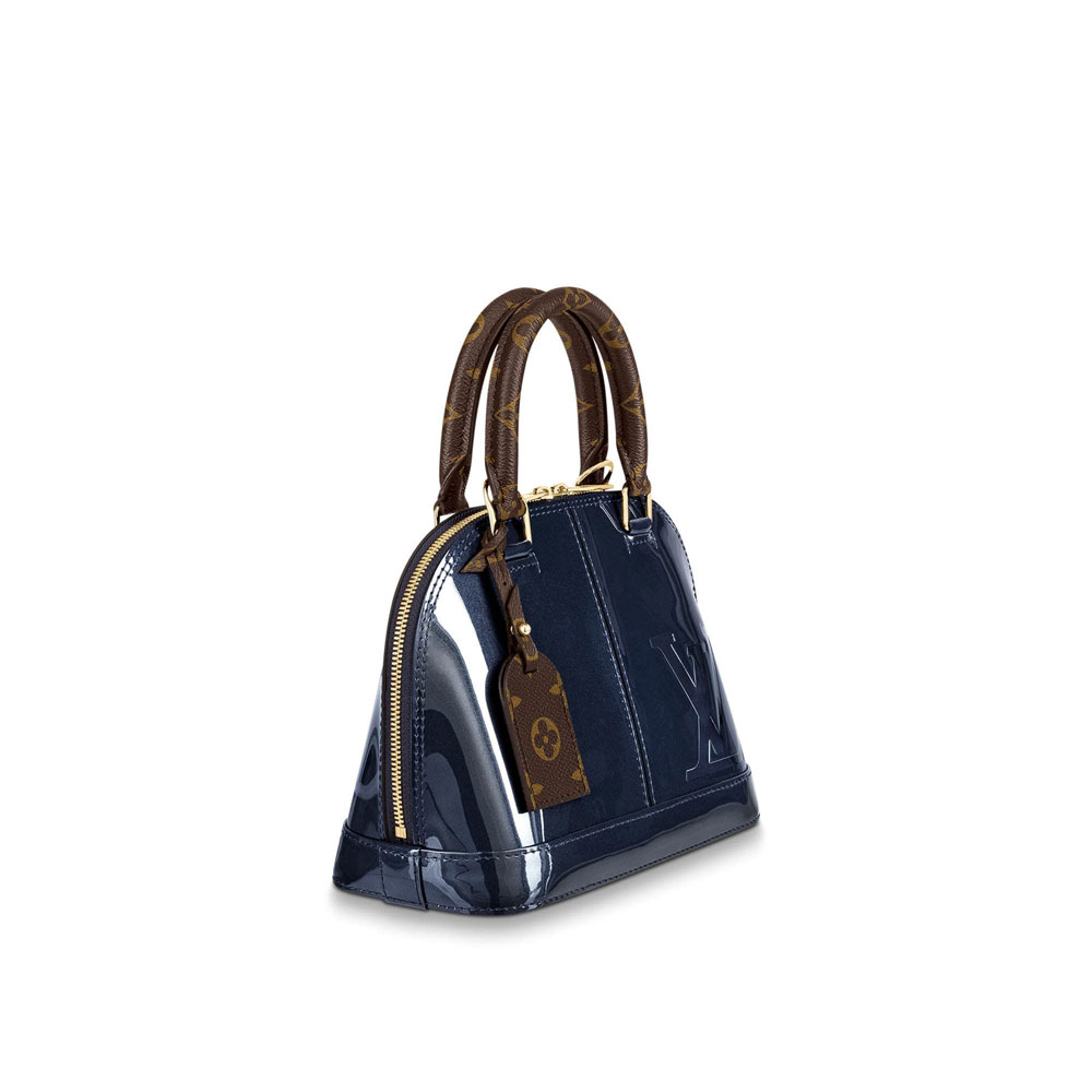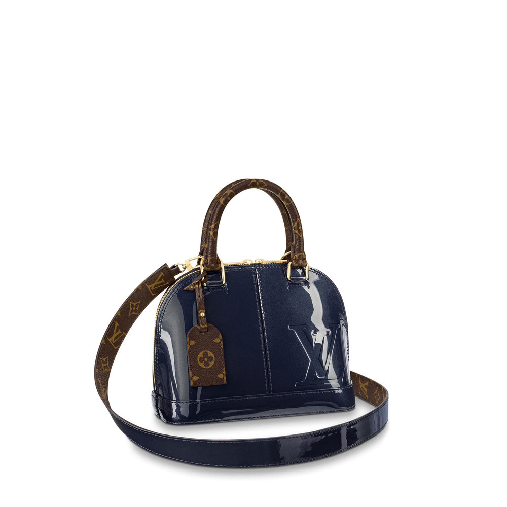 The Alma BB handbag traces its pedigree to the Art Deco original. introduced in 1934. This model in glossy patent calfskin is boldly accented with an oversized embossed LV. Signature details - hand-stitched Toron handles. Monogram key bell. engraved padlock - make this compact bag a classic. The removable cross-body strap combines Monogram canvas and patent calf for a modern look.
